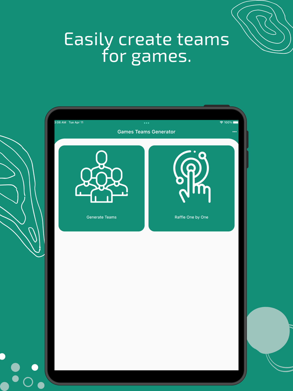 You can also divide players between teams one by one. Define the number of players and number of teams and start the division process. Just each player presses the button on the app and it will be shown which team he belongs to.