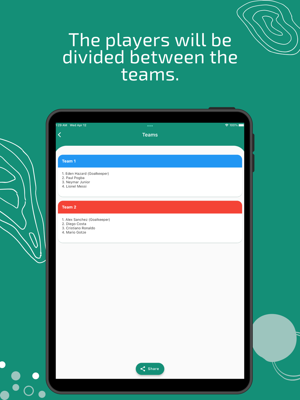 Define the number of teams and if you want to also define the number of players per team, select the players and the teams will be created for the match. You will be able to share the generated teams with your playmates.