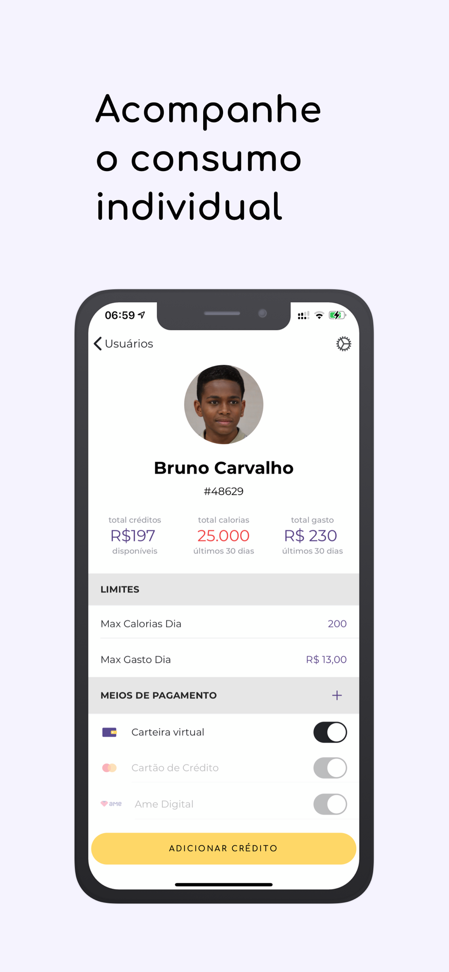 Controle gasto diário, consumo calórico, itens de cardápio e estabelecimentos de seus filhos. Insira créditos para cantinas, clubes, restaurantes e muito mais.