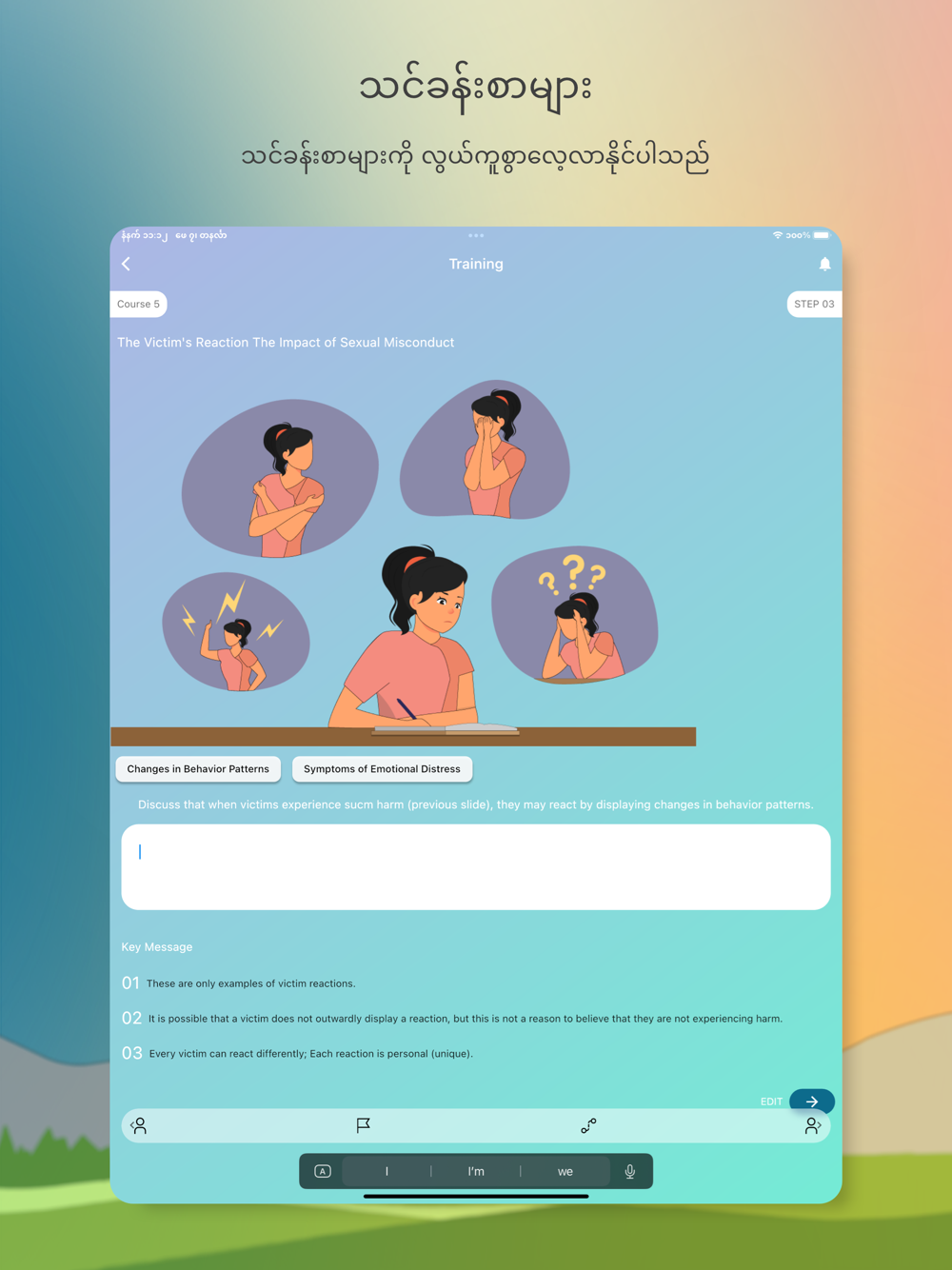- PSEA learning: the training curriculum is properly designed with 10 components where Basic concepts of SEA, Sexual misconduct definitions, Power dynamics, and Survival centered approach are mainly highlighted. In each component, simple illustrated pictures, videos, and case studies were used for the community level. At the end of learning, the completion certificate from the PSEA Myanmar network will be issued to each signed-up user.