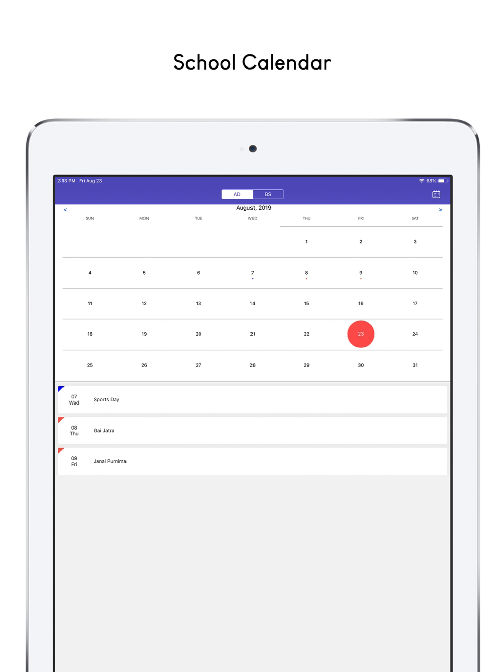 - School/College Calendar to get information on academic days, holidays, celebrations, exams, vacation & all important dates.