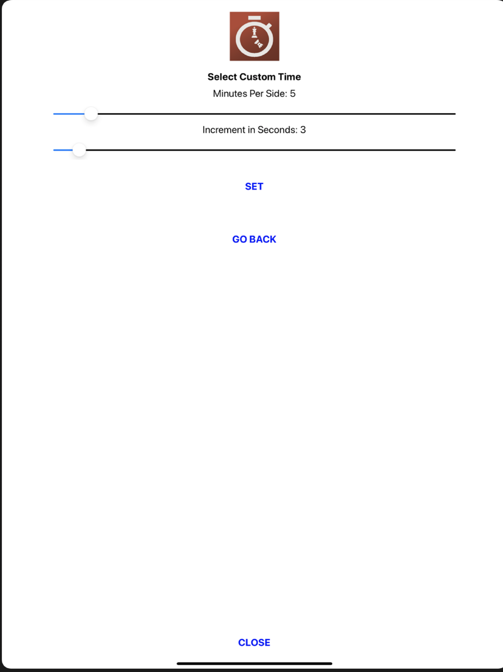 Keep track of your moves each turn. Playing competitively? Want to limit time for each player's moves? ChessTimer! provides the ability to play any chess game format with its game type menu. Don't see the time you want? Use the custom selection menu to create your own time and set how much time you get back after each turn