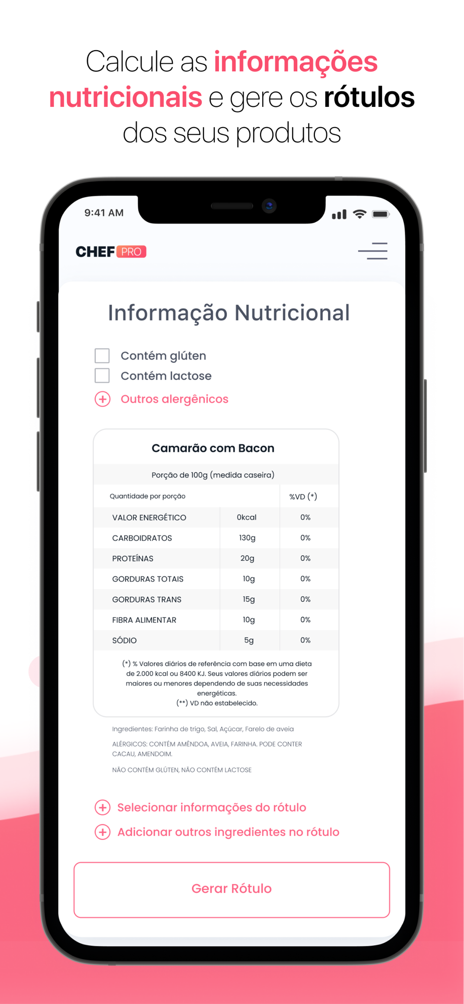 - Informação nutricional: Crie os seus rótulos nutricionais utilizando a integração com as tabelas TACO, IBGE e USDA. Ou crie uma info nutricional de acordo com o rótulo dos ingredientes que você utiliza.