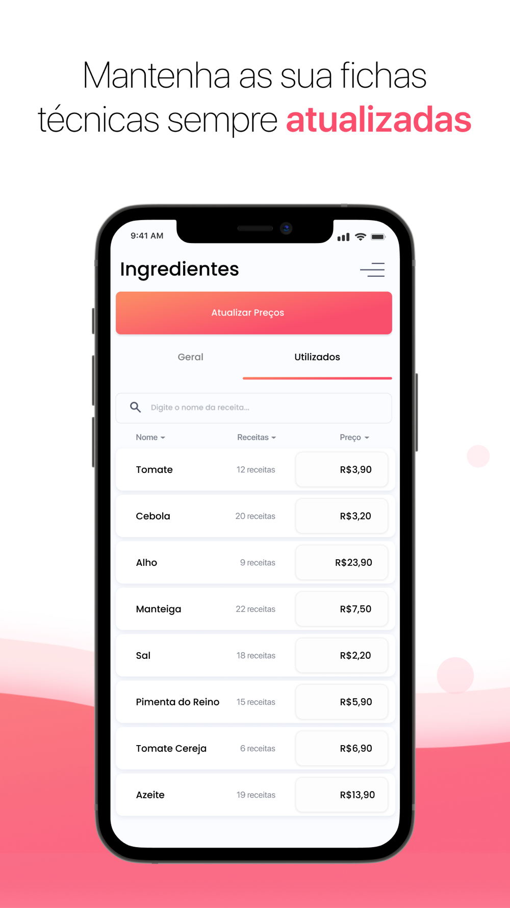 - Fator de correção: Calcule facilmente as perdas de cada ingredientes utilizando o índice padrão ou cadastrando de acordo com o seu uso.