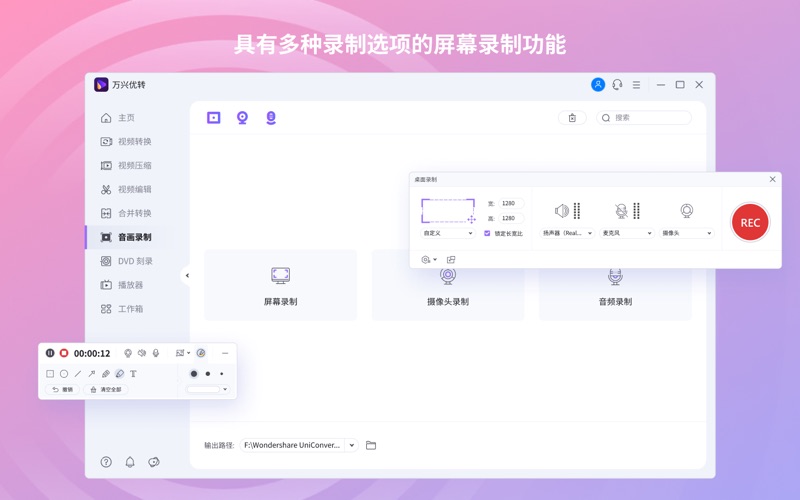 • 支持在录制过程中添加标记线、箭头、矩形绘制、圆形绘制、撤销、反撤销等操作。