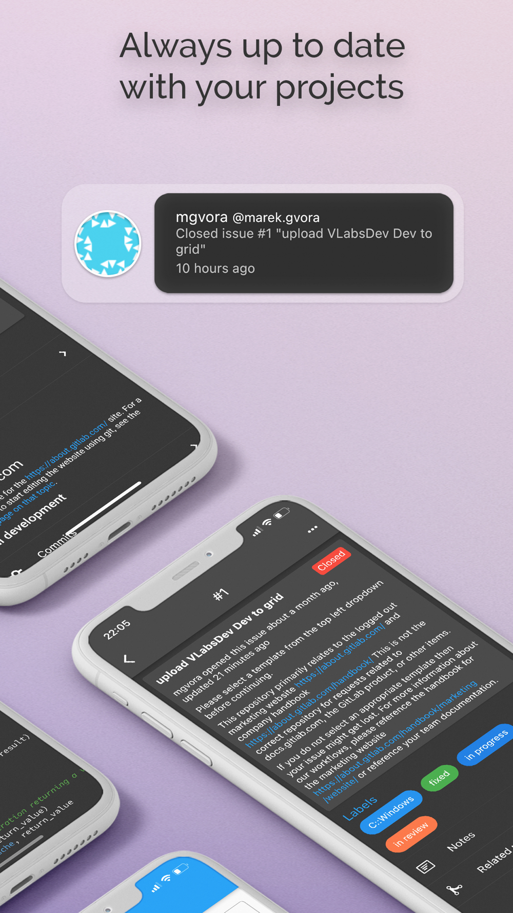 See the latest happenings wherever you are, reply to project issues so they can be taken care of faster, manage and organise projects with labels, browse your files, code and more !