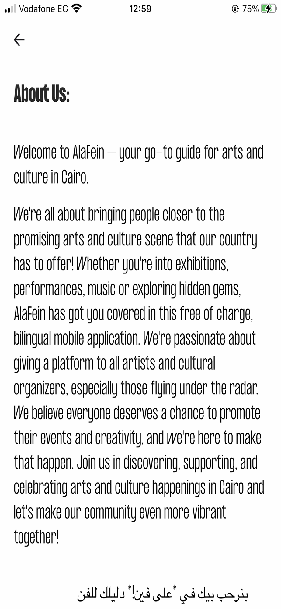 We're all about bringing people closer to the promising arts and culture scene that our country has to offer! Whether you're into exhibitions, performances, music or exploring hidden gems, AlaFein has got you covered in this free of charge, bilingual mobile application.