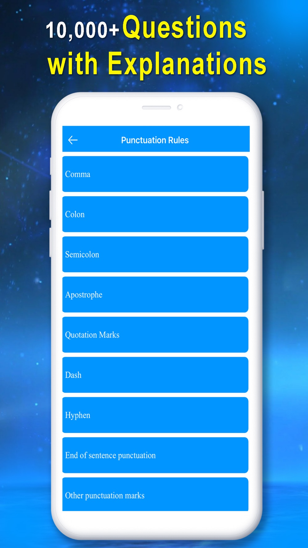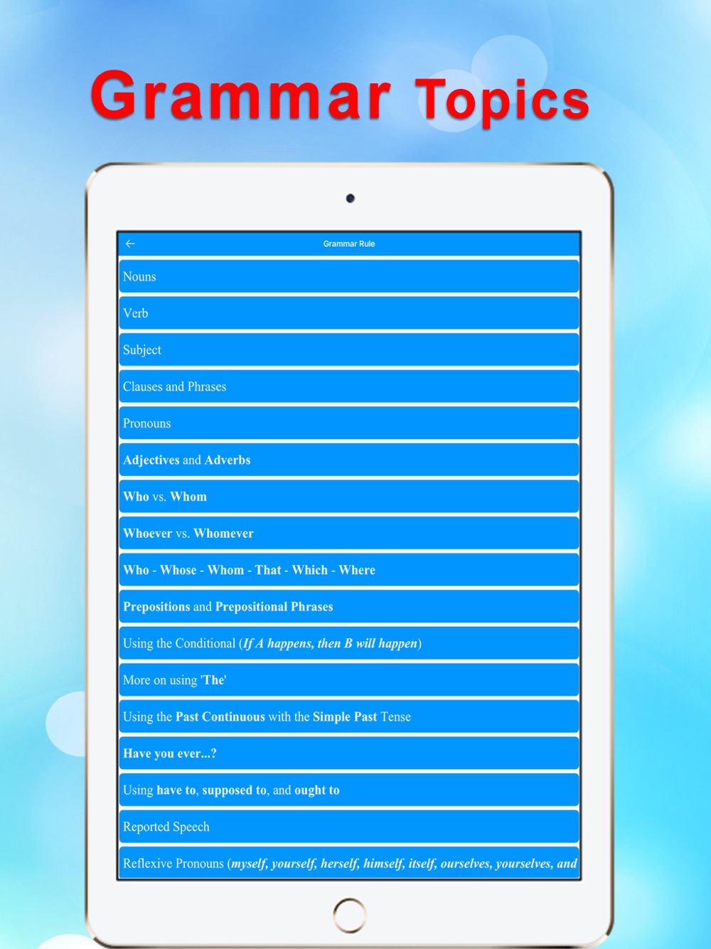 Firstly, you can learn English Grammar in order to enhance your command over English Language. It is an offline English grammar course, which will help you to get better in English. You can learn English Grammar rules, English Punctuation rules, Spelling and Vocabulary, most common verbs, most common phrasal verbs, most common irregular verbs and nonverbal adjectives. With all these exercises you can learn proper English grammar.