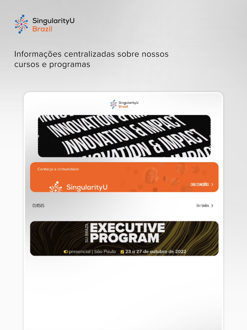E agora de uma forma ainda mais fácil e acessível: através do APP SU, onde é possível ter acesso a informações a respeito dos programas e cursos da SingularityU Brazil que você está inscrito. Confira a agenda de palestras, workshops e experiências práticas; obtenha os materiais disponibilizados pelos facilitadores dos momentos; conecte-se com os demais participantes e faça parte do nosso ecossistema.