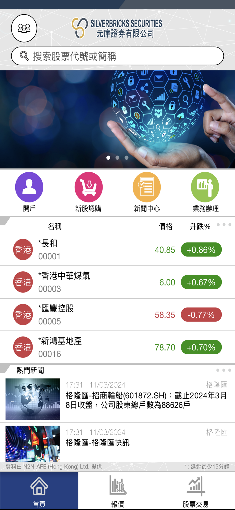 Silverbricks Securities Company Limited ("Silverbricks Securities") is primarily engaged in the securities and brokerage business and licensed by the SFC for Type 1.2.6 regulated activities. Silverbricks Securities provides diversified financial services with all rounded products and service suite for institutional and retail clients.