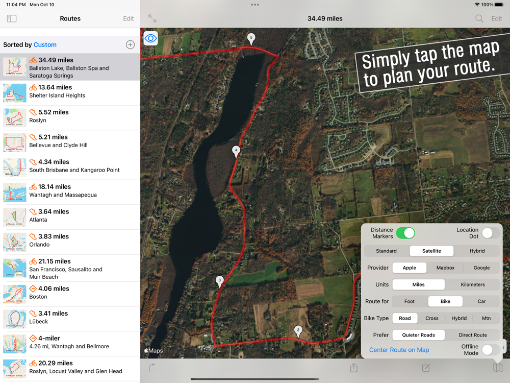 • Plan biking, running or walking routes while customizing them to be both enjoyable and safe. You can simply tap your start and destination points, or tap roads or paths you’d prefer to use along the way. You can drag the route to customize it as well.