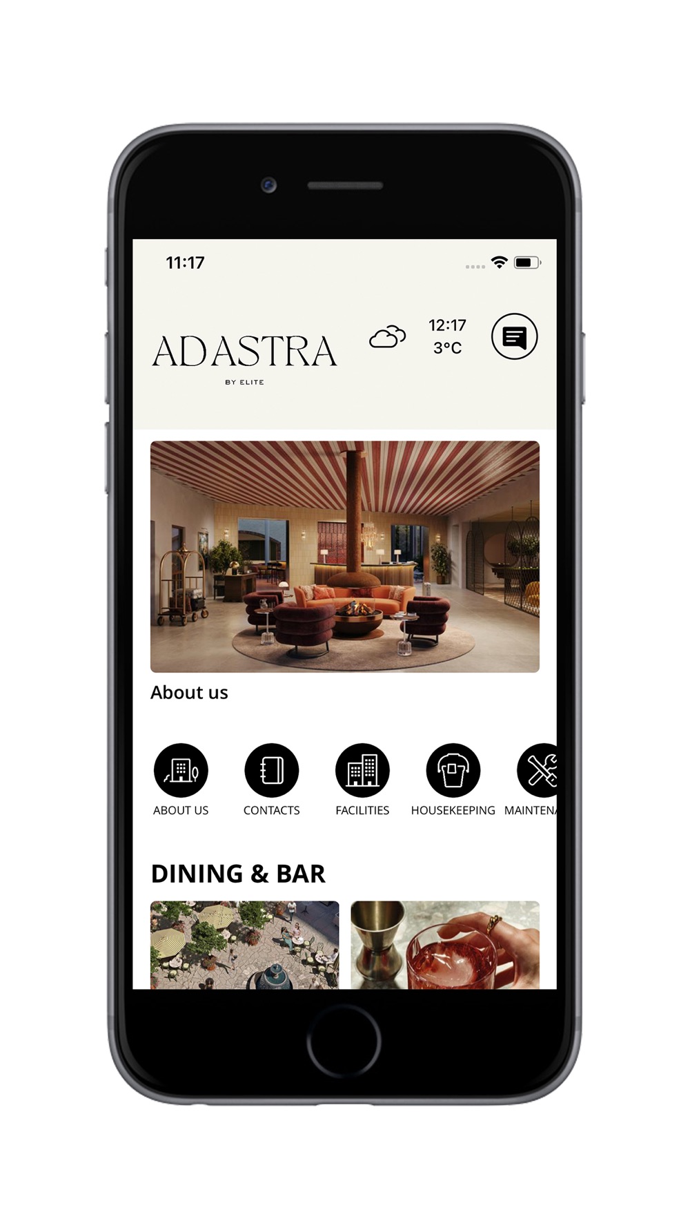 Ad Astra by Elite is a newly opened Italian signature hotel with a premium approach located in beautiful Snäckviken south of Stockholm. The hotel has handpicked some of the absolute best gems of the Mediterranean when it comes to food, relaxation and entertainment. With this app, you will have the possibility to use a real time Chat with the Hotel staff, send services requests and even control the TV Room. The hotel has hand-picked some of the absolute best gems of the Mediterranean Sea when it comes to food, relaxation and entertainment. With the app, you will have the possibility to check restaurants information, see the menus and book a table at our restaurants. Everything from Italian restaurants, a fantastic spa and entertainment such as cinema and pétanque. A wide range of everyday luxury, entertainment and a place to recharge your batteries.