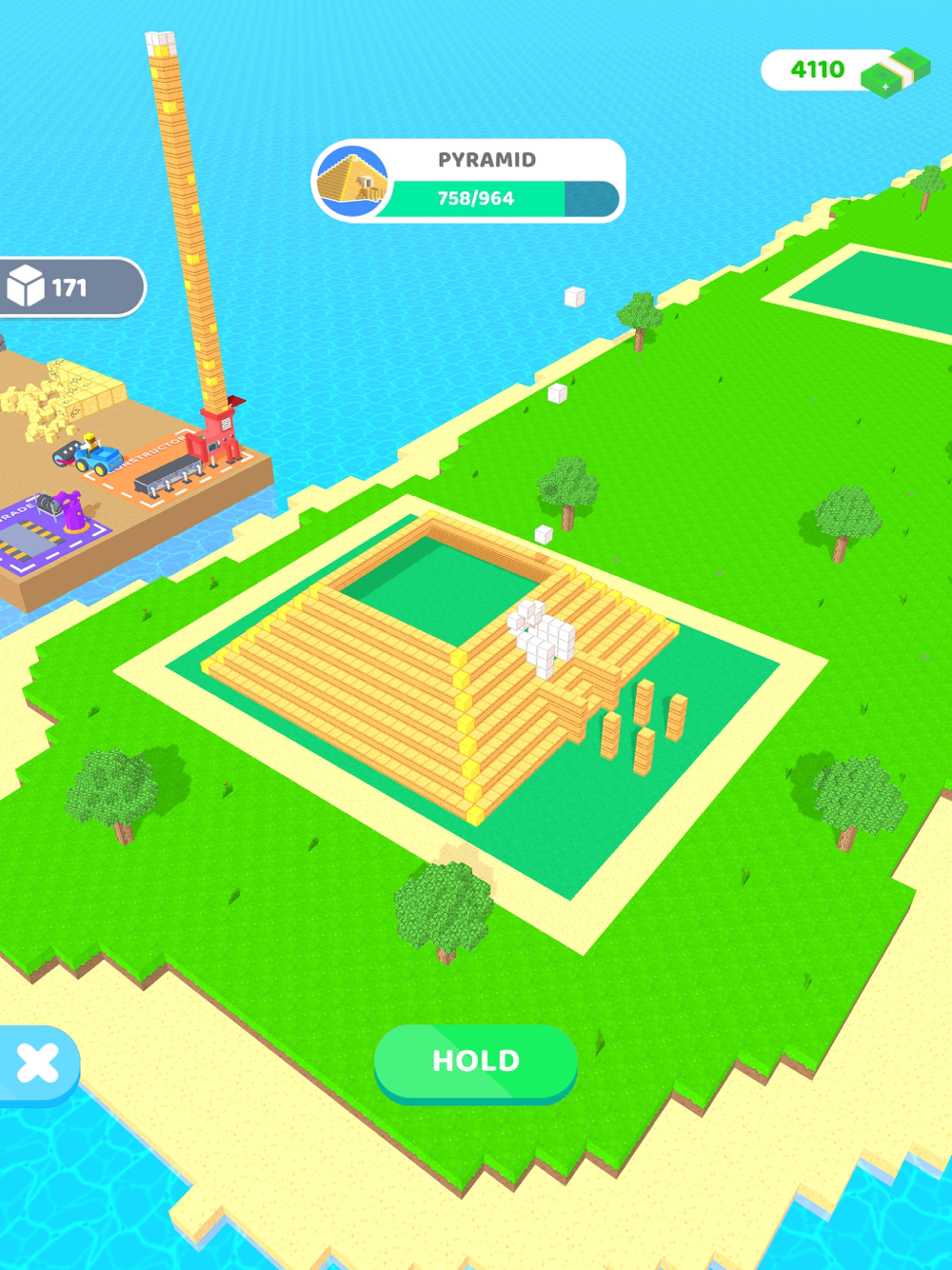 An idle arcade where the player mines cubes and then uses them to construct buildings