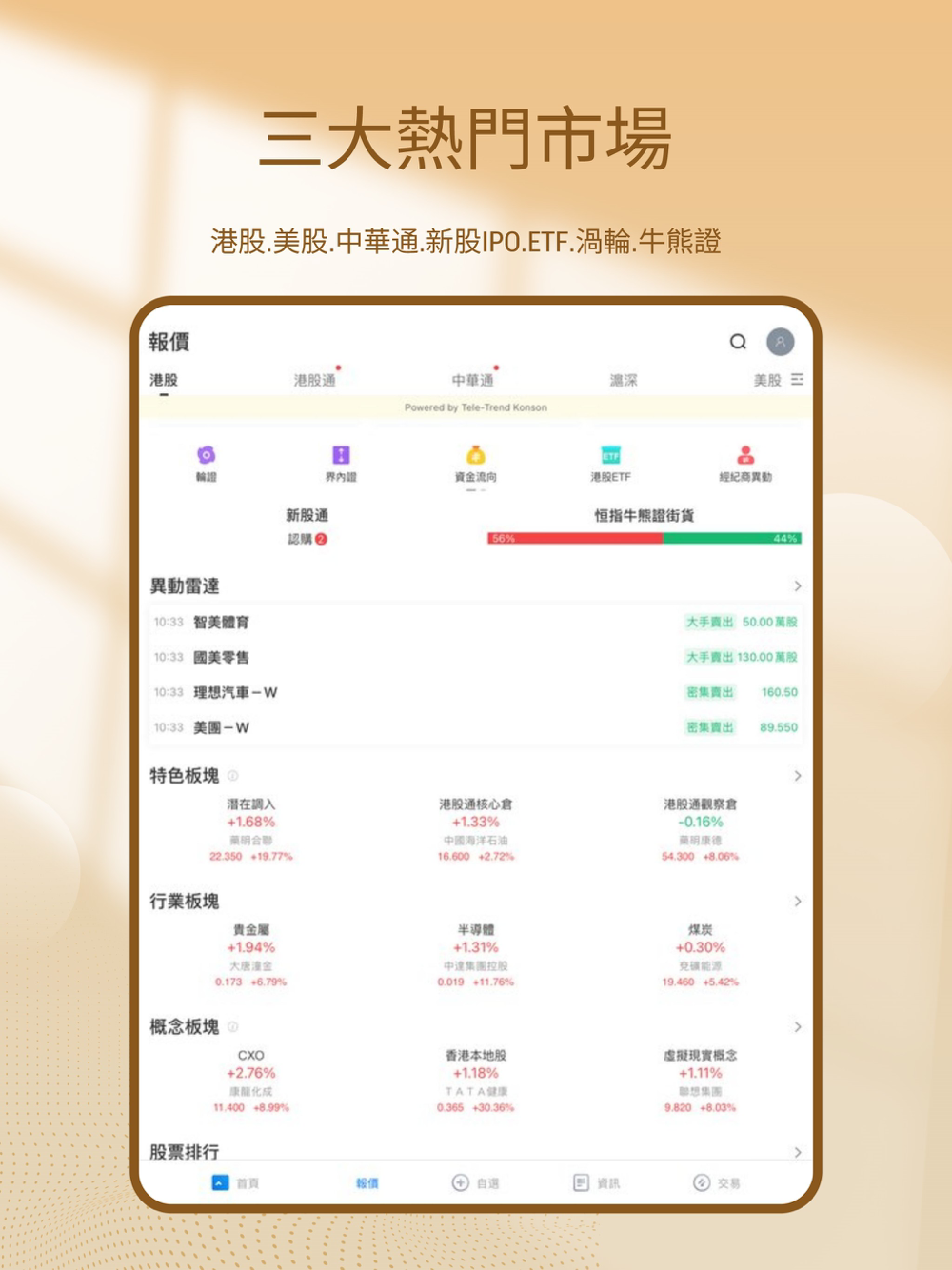 軟庫中華證券之軟庫中華交易寶,一手掌握最新行情及全面的市場資訊,輕鬆查看股市資訊及快捷交易,緊握交易市場脈搏。