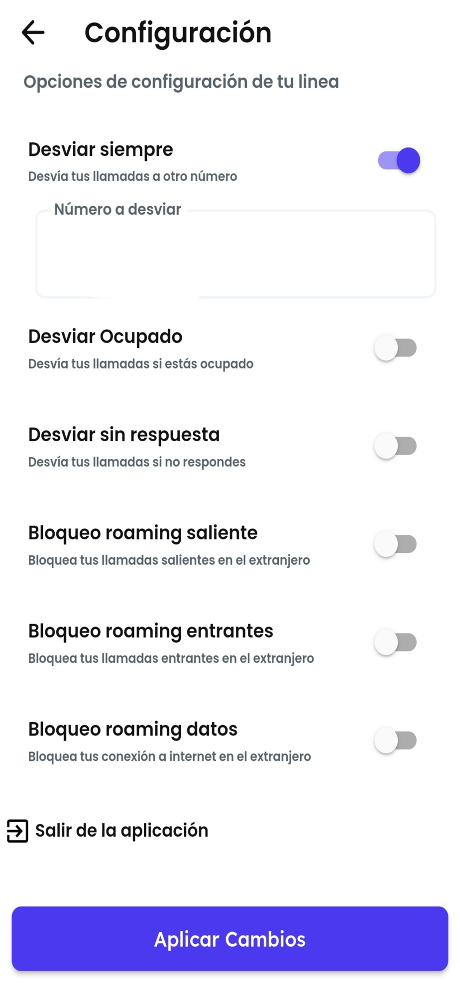- Activa o desactiva el desvío de llamadas, introduciendo el número al que quieres que se desvíe.