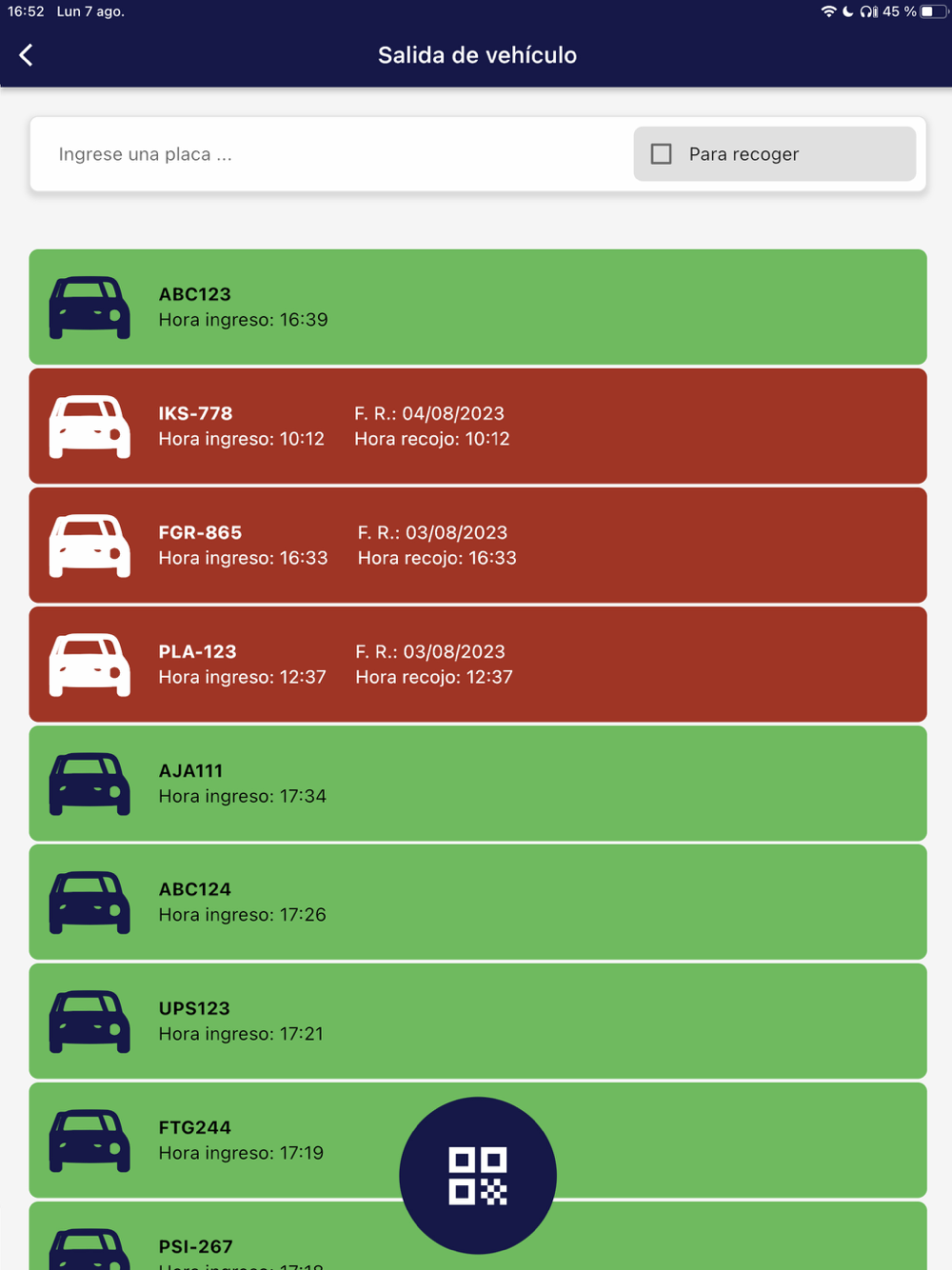 Visualizar los vehículos que entraron, salieron y los que están listos para recoger.