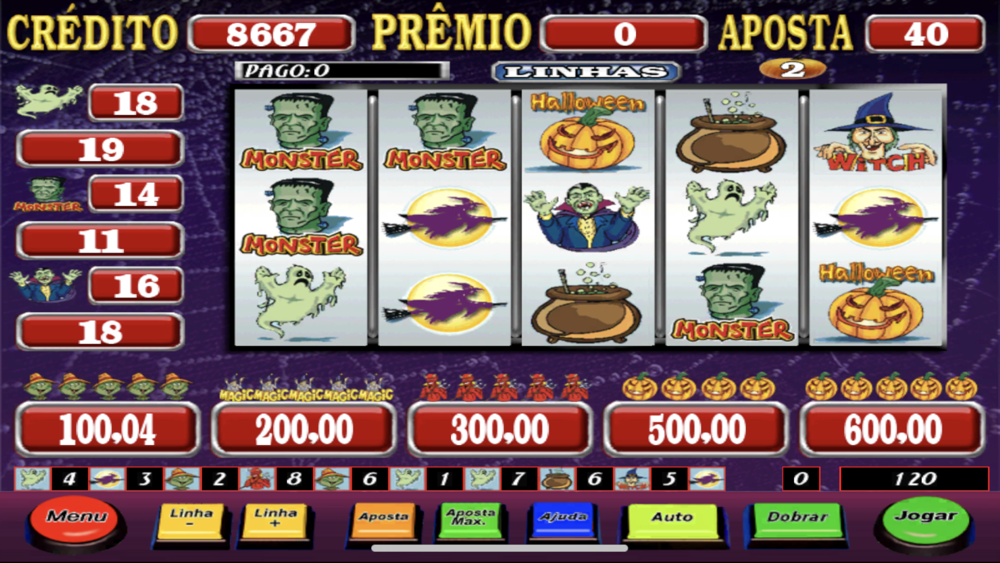 Halloween Ex 25 linhas (Aquela lançada em meados de 2007 com 3 acumulados e pagando nas linhas verticais. Essa foi estouro na época!)