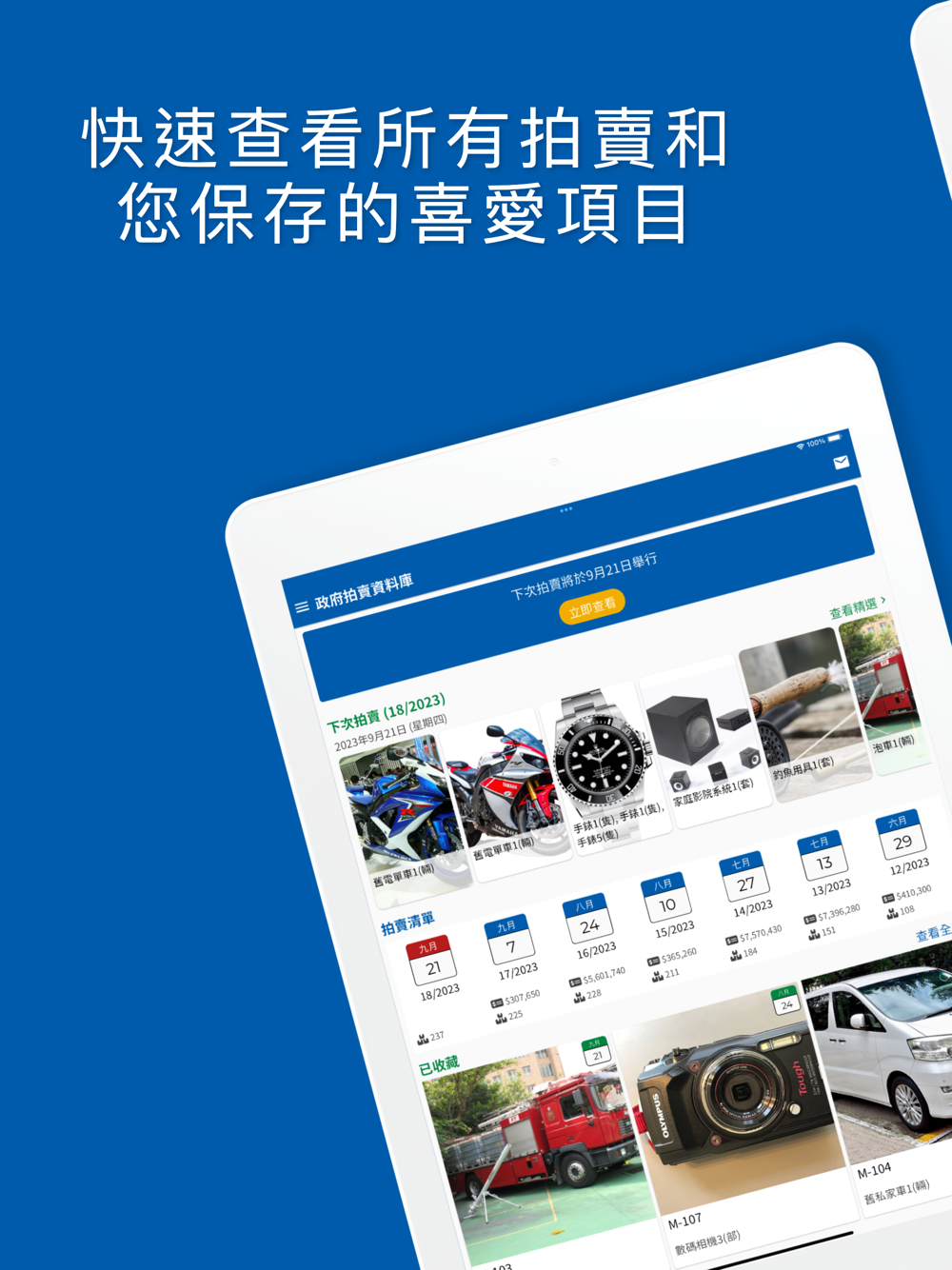 《政府拍賣資料庫》流動應用程式已加至「資料一線通」(https://data.gov.hk/tc/application/auctiondbgov)。從數碼相機到消防車,您可以從我們全面的公開拍賣清單中探索您喜歡的拍賣物品。