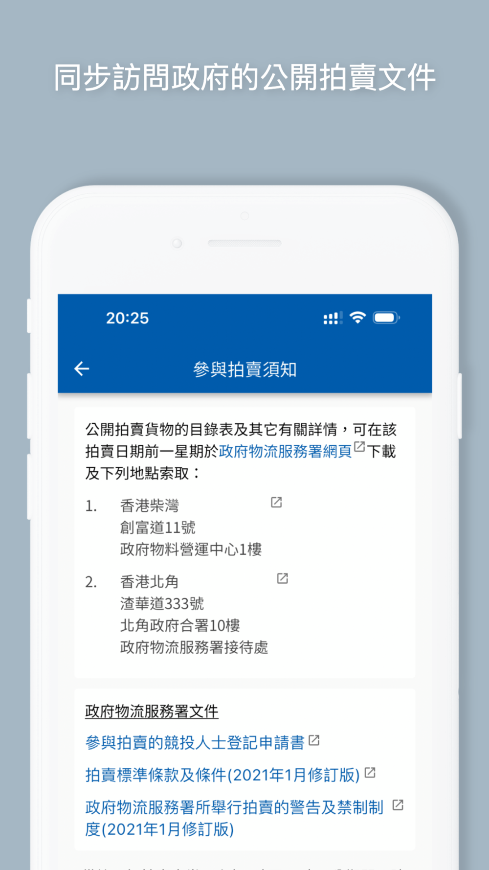 本流動應用程式基於香港政府開放數據計劃,綜合利用「資料一線通」(data.gov.hk)和政府物流服務署網站(gld.gov.hk)提供的開放數據,整理了公開拍賣的資料,並免費提供給公眾使用。其主要功能包括: