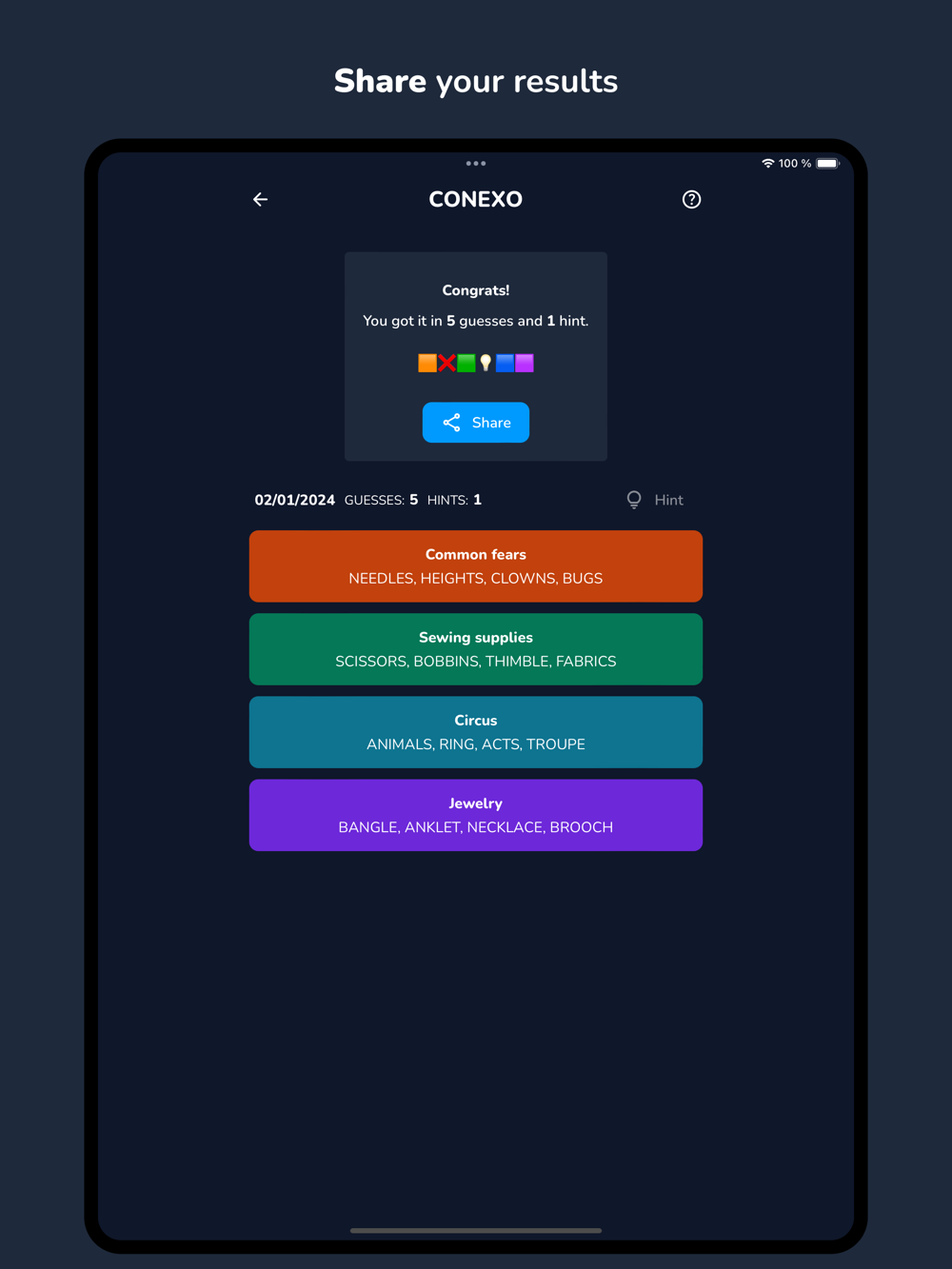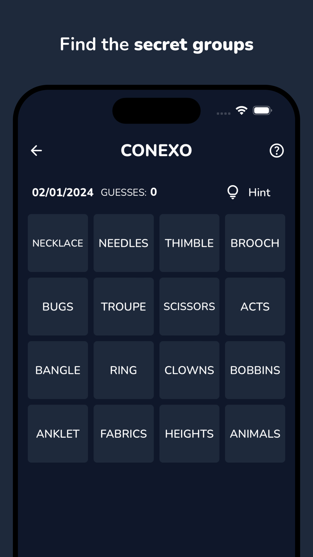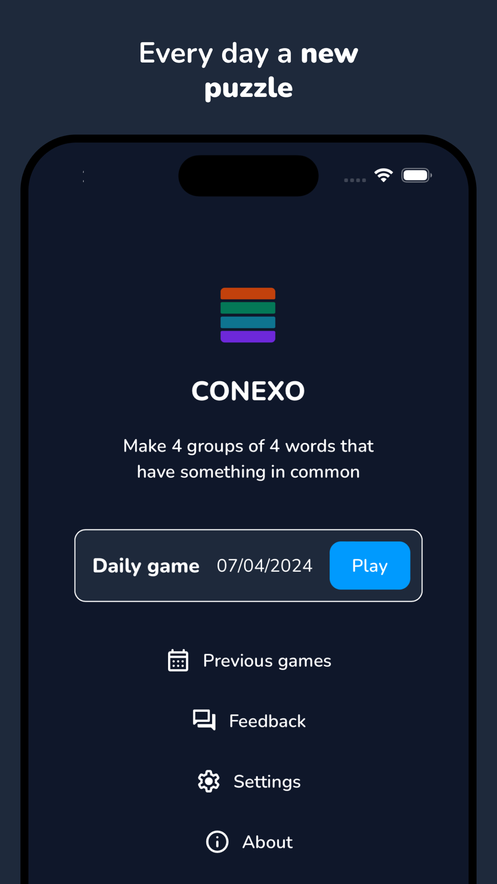 Conexo is a puzzle and word game where you need to find 4 secret groups made of 4 words that share a secret theme.