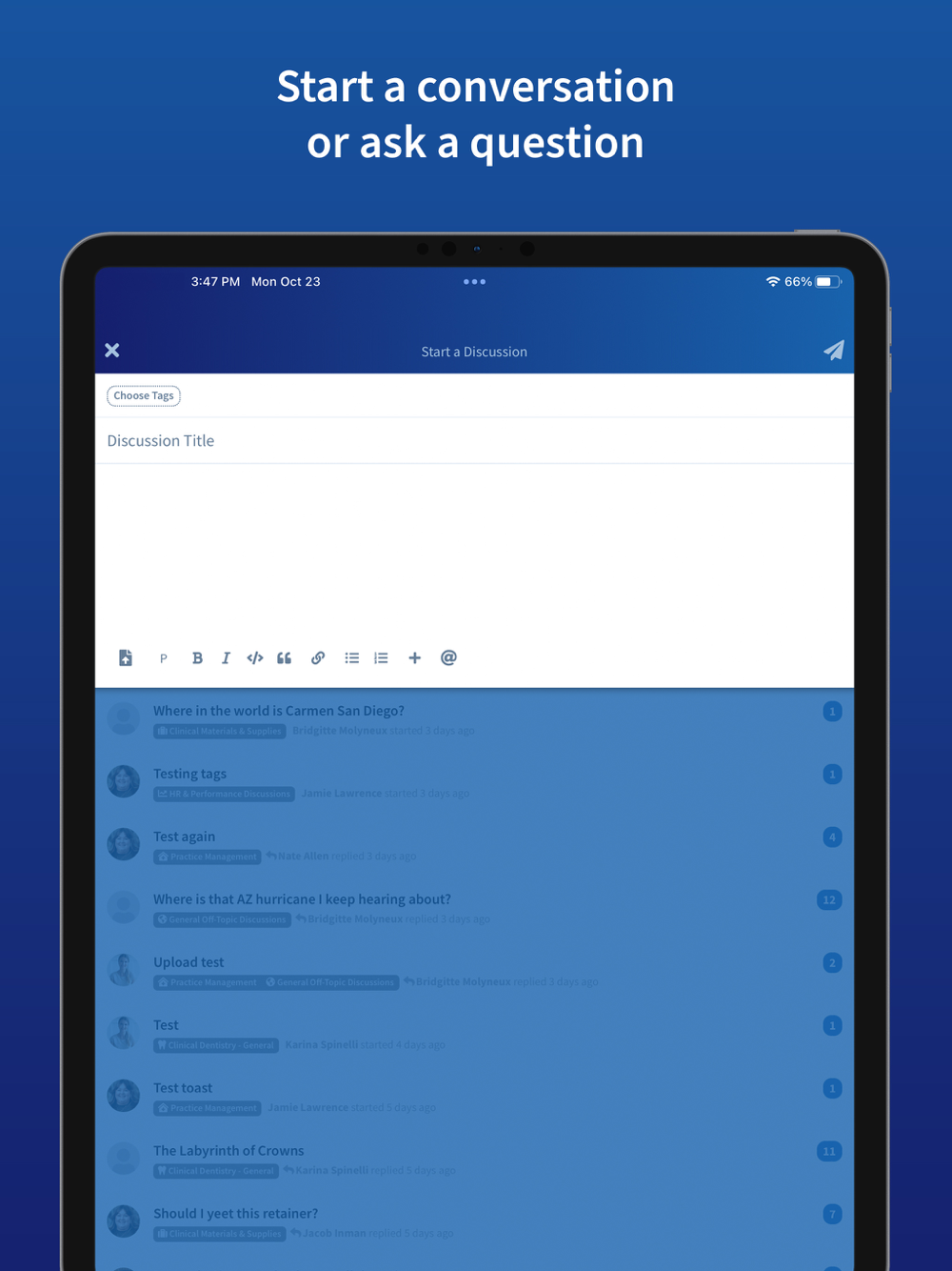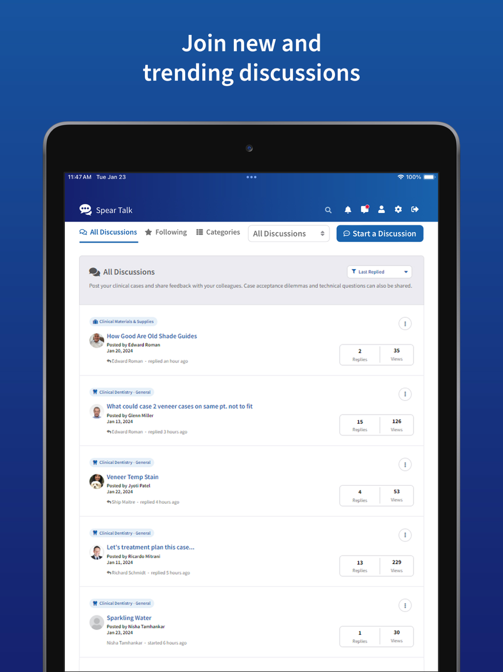 Spear Talk is a members-only forum community for dental professionals to network, get expert advice, and share successes together. Join the conversation with a variety of topics across clinical dentistry, practice management, and more. With the new mobile app, now clinicians and team members can have their dental community with them anywhere they go.