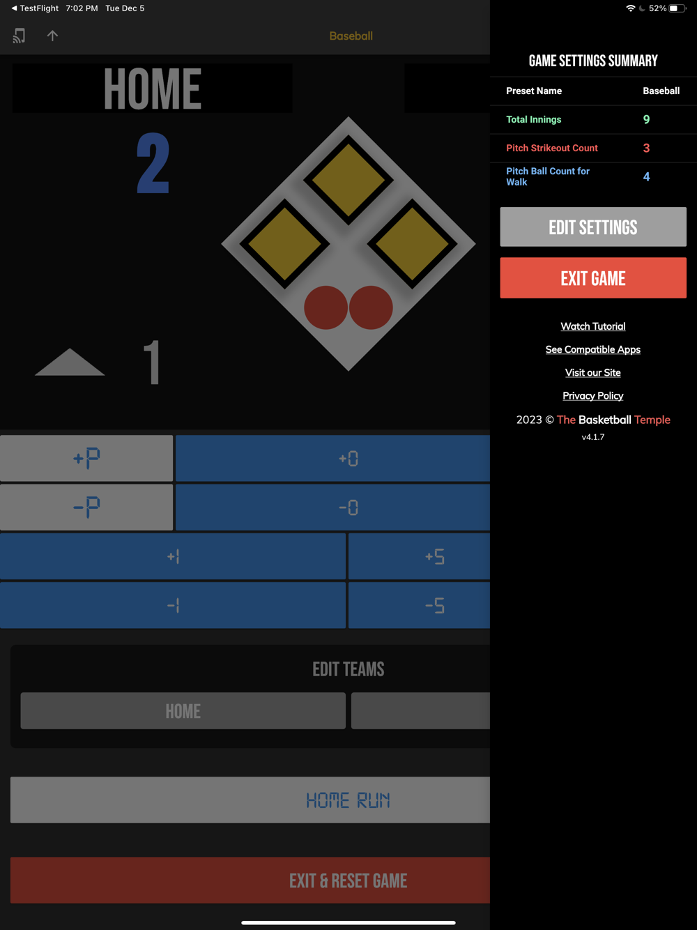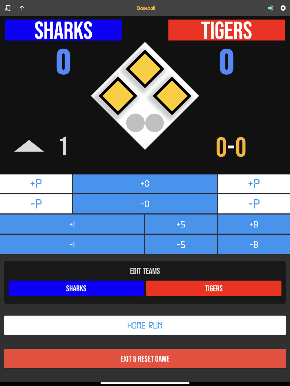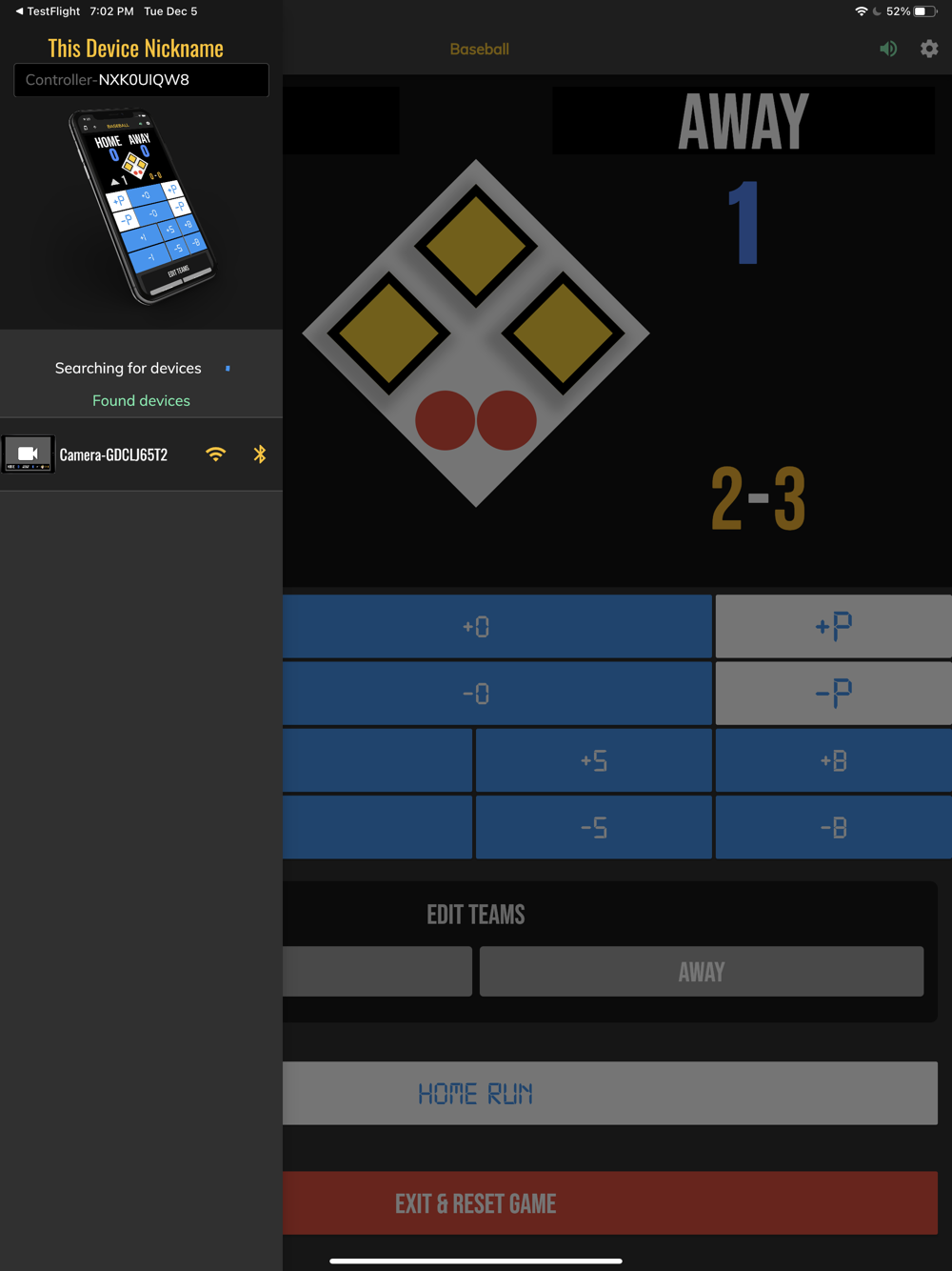 The BT Baseball Controller app is a free app meant to be used to remotely control supported BT Baseball scoreboards and score camera devices.  The app synchronizes the score and stats on all these supported devices.  The interface is extremely clean and intuitive, everything is directly touch or swipe based.  Clearly labeled controller buttons are also added for those that prefer a button interface.