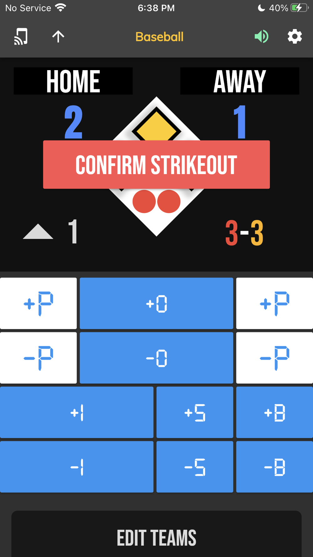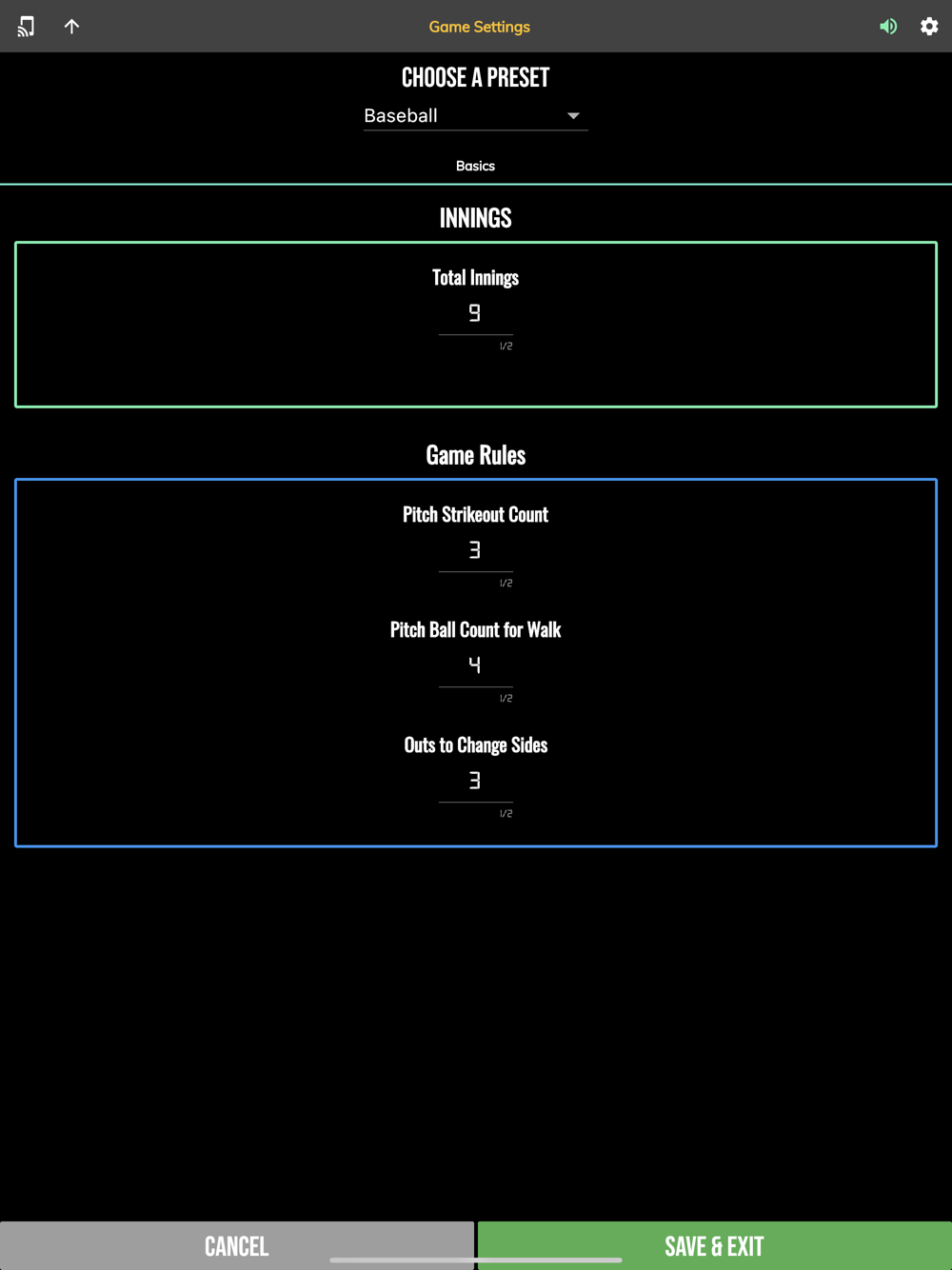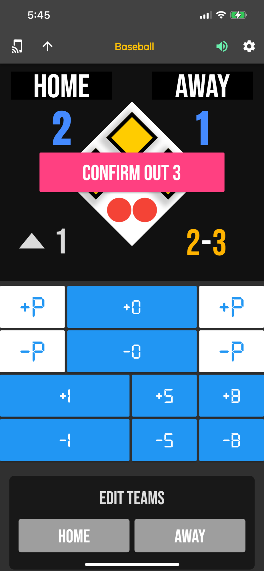 The BT Baseball Controller app is a free app meant to be used to remotely control supported BT Baseball scoreboards and score camera devices.  The app synchronizes the score and stats on all these supported devices.  The interface is extremely clean and intuitive, everything is directly touch or swipe based.  Clearly labeled controller buttons are also added for those that prefer a button interface.
