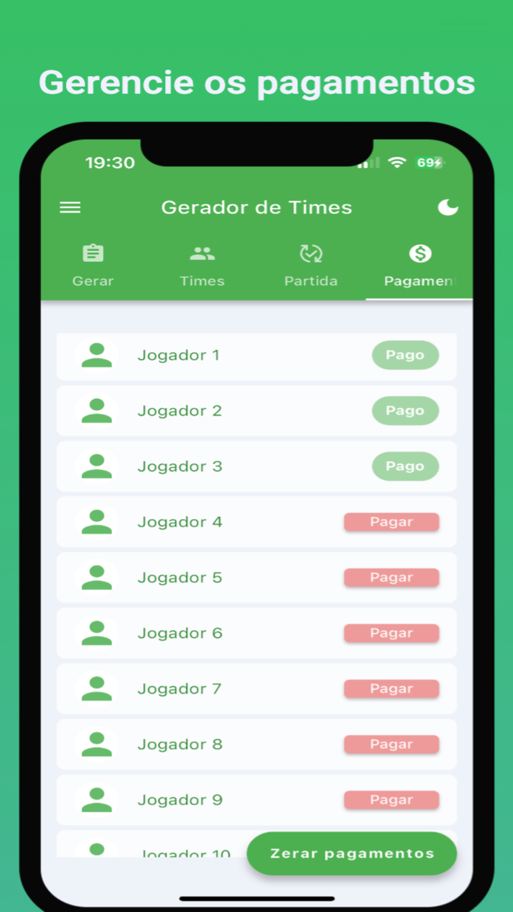 Monte os times, controle o jogo, registre os gols e gerencie os pagamentos — tudo em um só app!