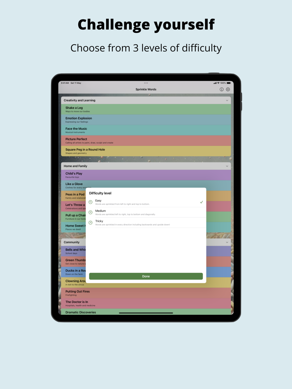 Tailor the challenge to your skill level with Easy, Medium, or Tricky puzzle options.