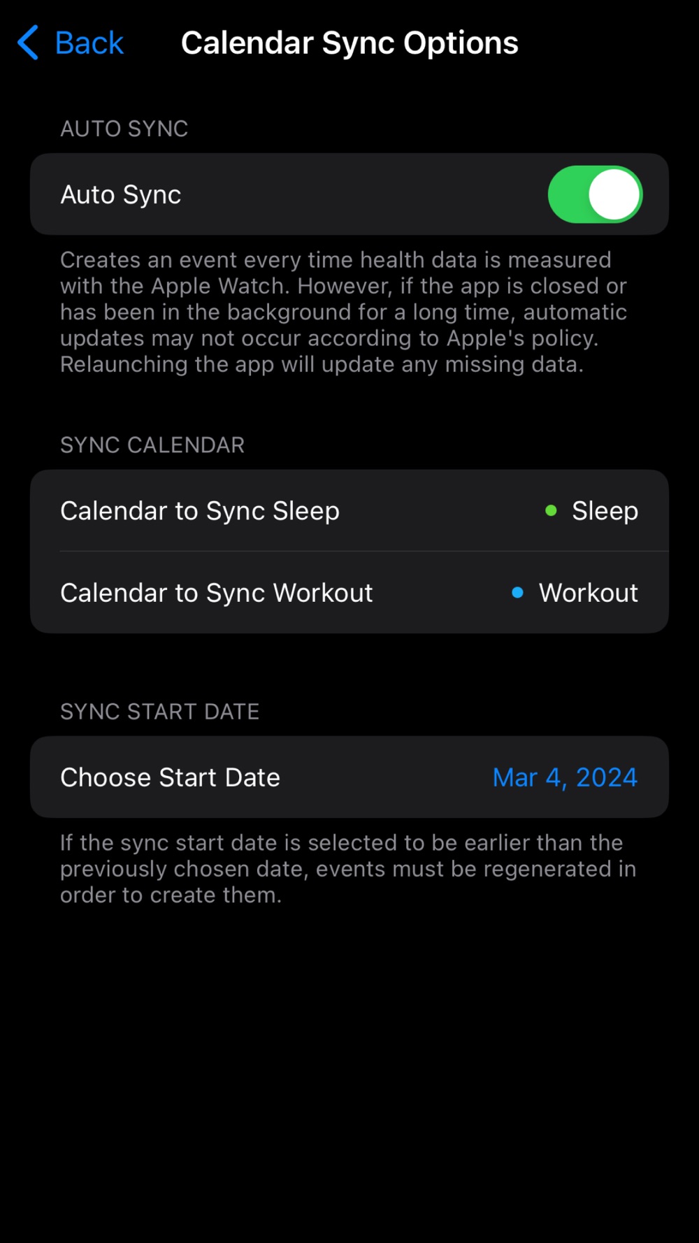 - The title, notes, and time of the event can be customized based on your health data. You can include the type of exercise and calories burned in the title, or simply use “Exercise” as the title and include details such as exercise type, calories burned, and distance in the notes. You can also adjust the event time based on the duration of sleep and exercise. For instance, an exercise conducted from 08:02 to 08:42 can be set exactly as is, or expanded according to user-set values to cover 08:00 to 09:00.