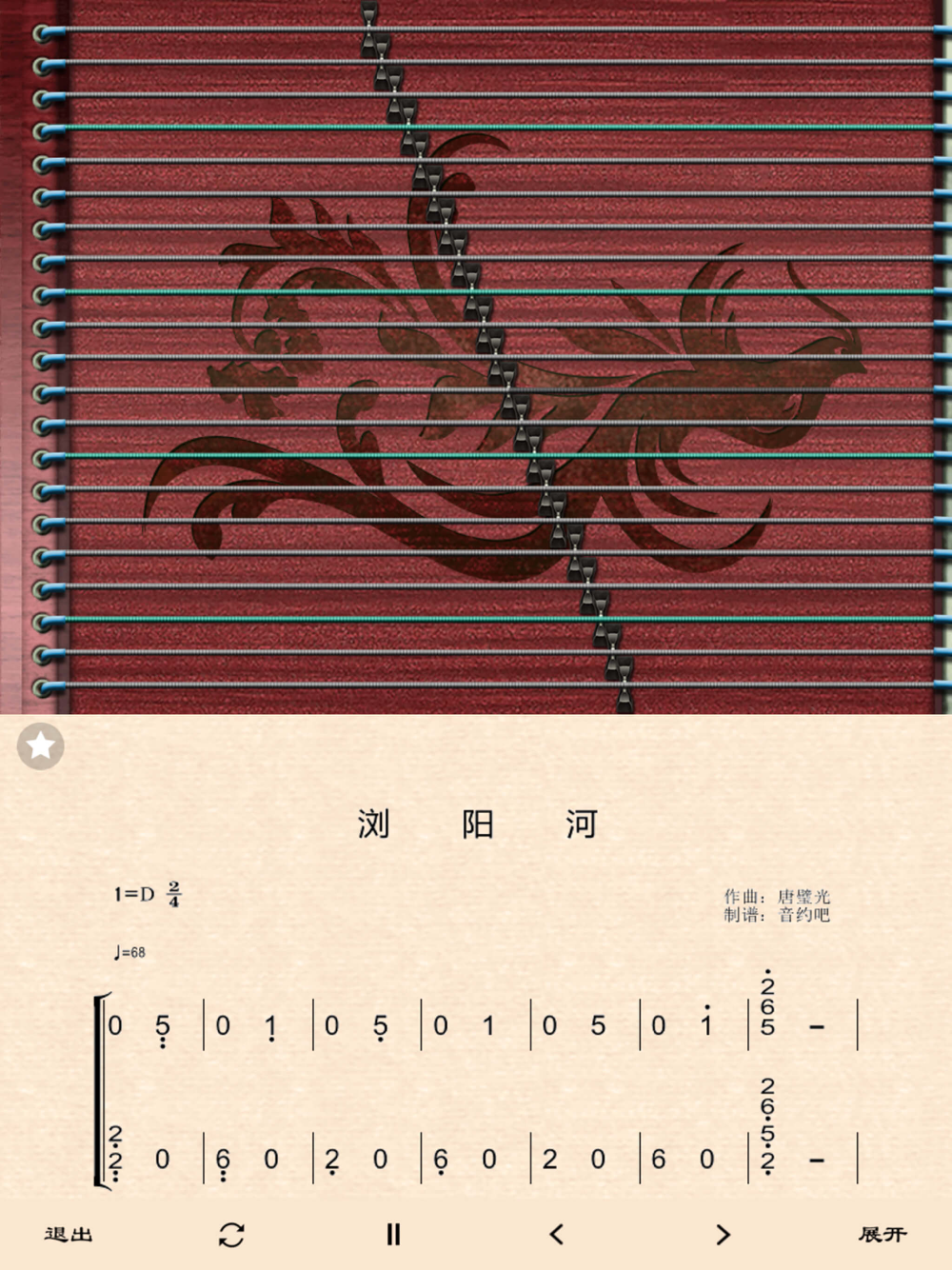 2.歌曲页面,纳入了许多古筝考级曲、练习曲等,以及曲谱