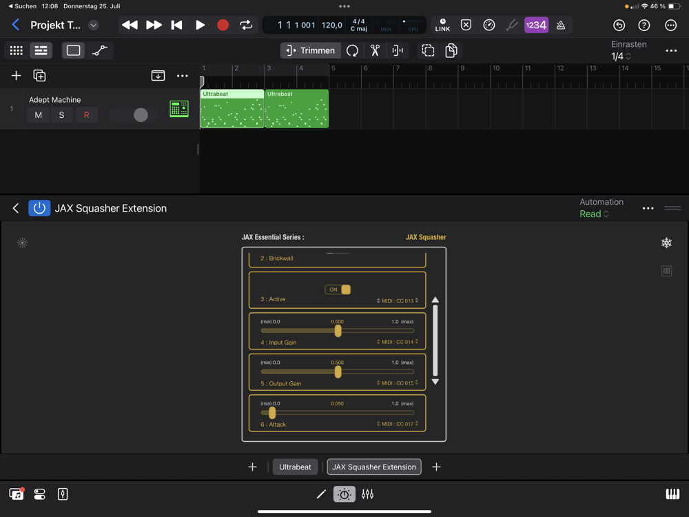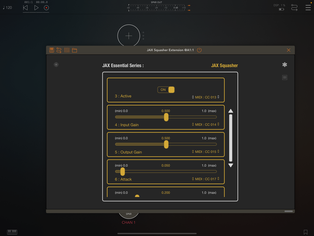 The JAX Squasher is a self adjusting loudness maximizing limiter with super easy adjustment. Just increase the input gain or tweak the threshold parameter up to the desired level. Very short attack and release times can produce harmonic distortion but the effect is intended to be used for transparent limiting / loudness compression results.