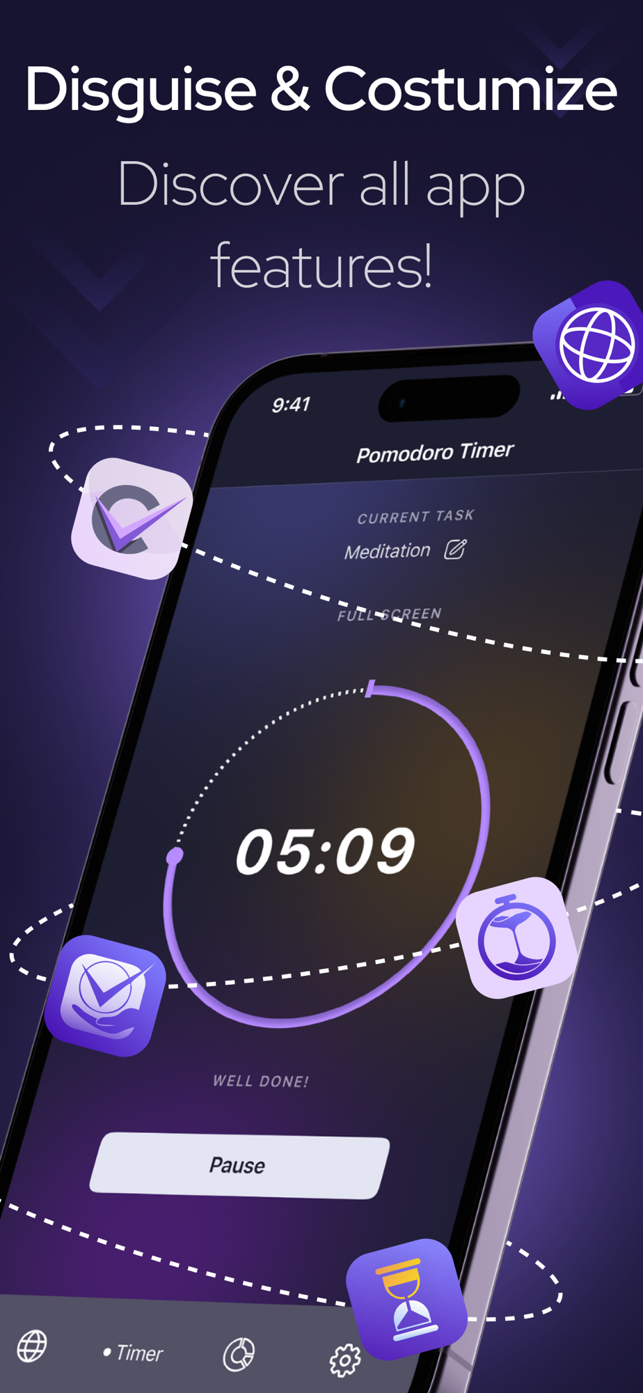 You are not limited to the browser alone! There is a huge range of functions at your disposal. So, a Pomodoro timer is available to you, which will help you control your work and rest time. Just add the name of the task and start the timer. In addition, the timer provides you with detailed statistics analyzing how much time you spent completing your tasks and resting throughout the day. Improve your time management! Now you don't have to worry about the security of your browsing, because the application blocks possible threats. Statistics of blocked threats are also available to you. You will not be bored, because now you have the opportunity to choose from several different application icons, the one that you like. Forget about ads and a regular browser along with ProofGuard!