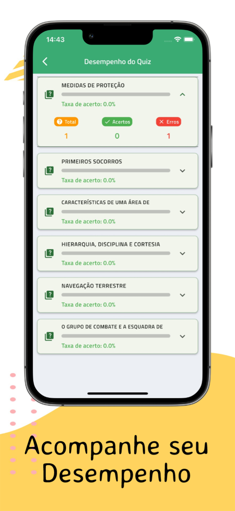 Saiba exatamente onde você está acertando ou errando! Após responder aos quizzes, visualize seu desempenho por assunto e adapte seus estudos com base nos seus resultados.