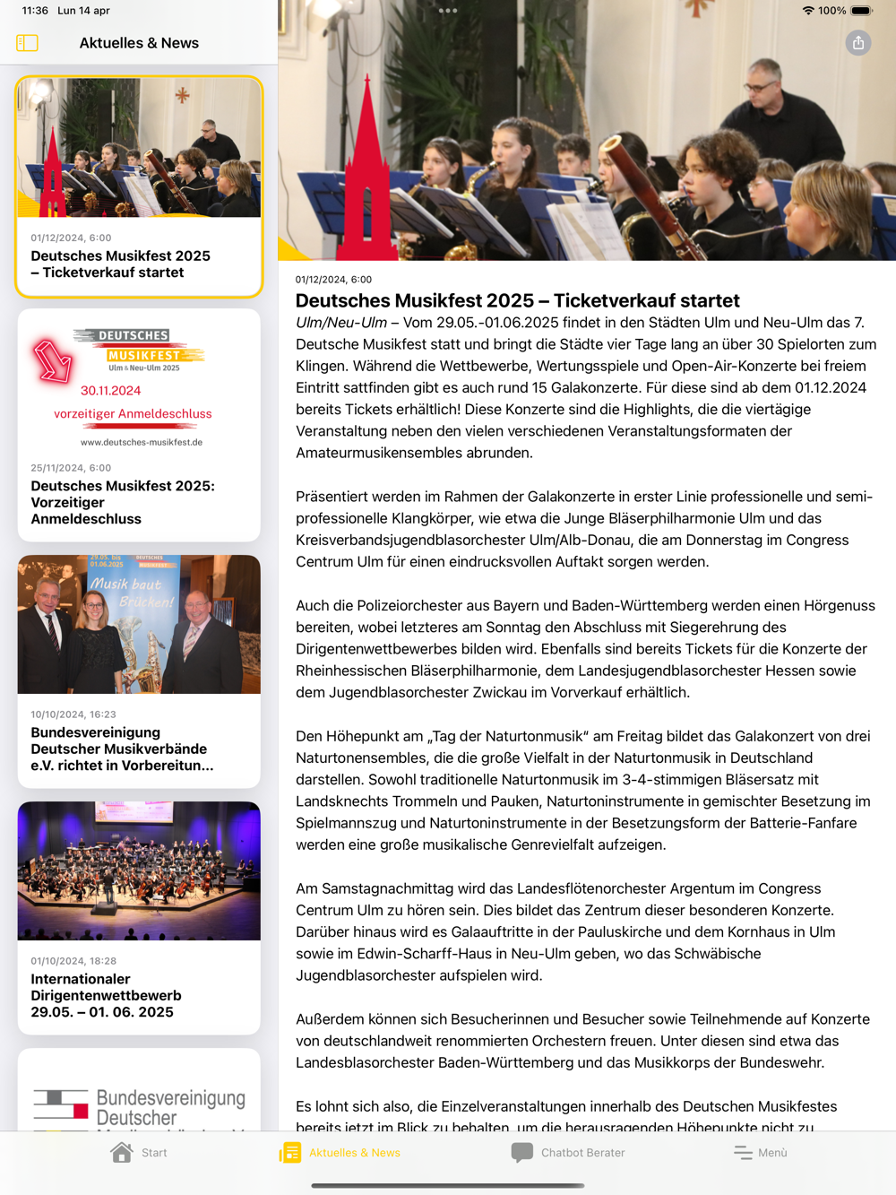 Die offizielle App zum Deutschen Musikfest 2025 in Ulm und Neu-Ulm bietet Besuchern umfassende Informationen und Funktionen für ein unvergessliches Musikerlebnis. Mit der App können Nutzer das vollständige Programm der vier Festivaltage einsehen, einschließlich der Wertungsspiele, Wettbewerbe und Galakonzerte. Interaktive Stadtpläne erleichtern die Navigation zwischen den über 30 Spielorten in Ulm und Neu-Ulm. Zusätzlich bietet die App aktuelle Nachrichten und Hinweise zu Veranstaltungen, Unterkünften und Anreisemöglichkeiten. Sie kann kostenlos heruntergeladen werden. Mit dieser App haben Besucher alle wichtigen Informationen stets griffbereit und können das Musikfest in vollen Zügen genießen.