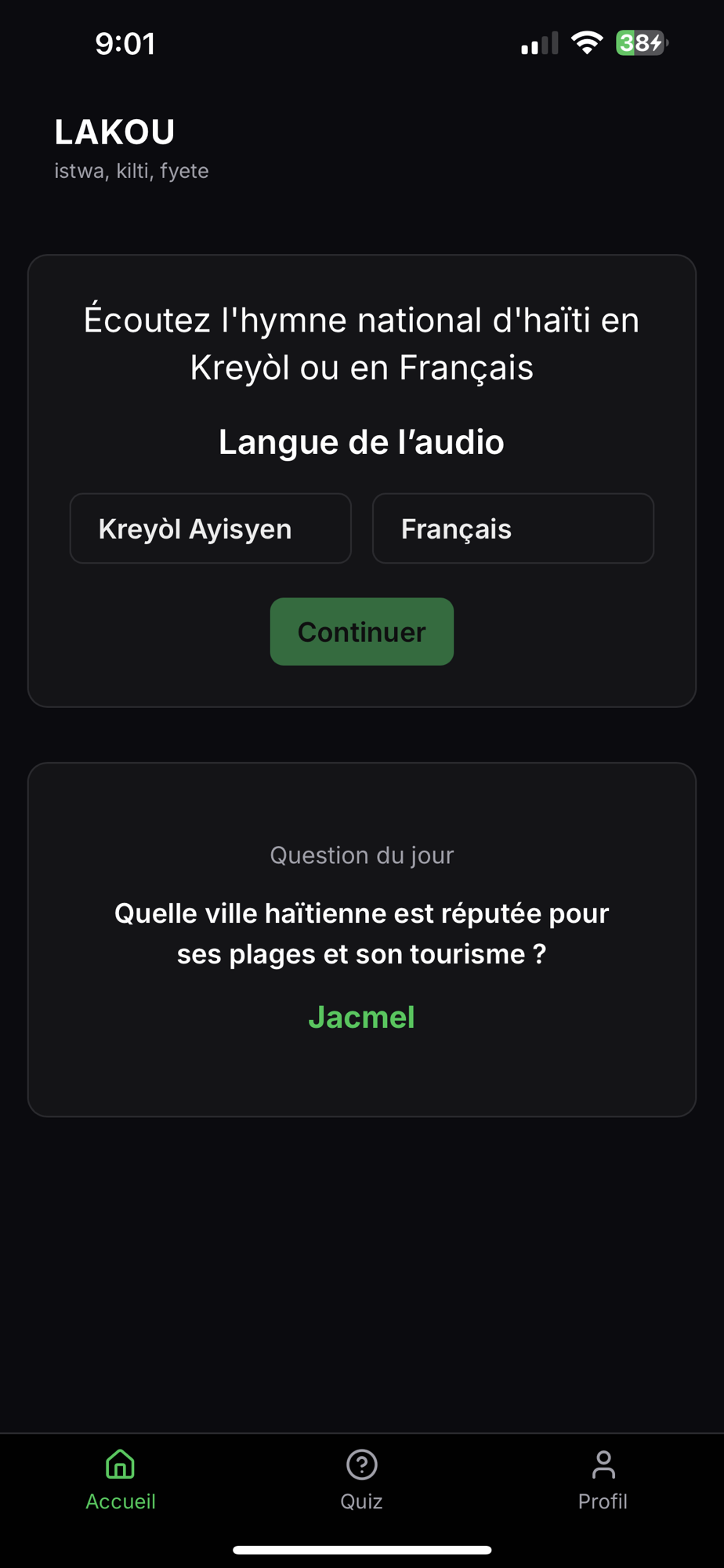 Lakou vous reconnecte à la culture haïtienne. Écoutez l’hymne national en français et en créole avec surlignage des paroles, puis testez vos connaissances avec des quiz rapides et ludiques.