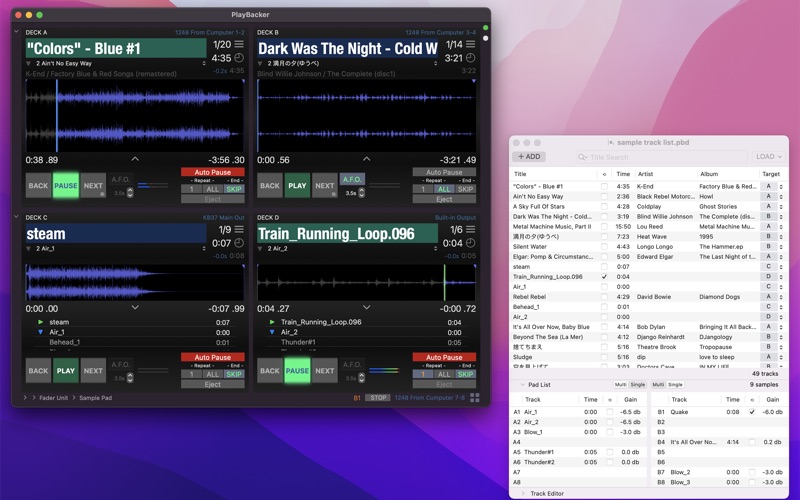 The advanced audio file player application equipped 4 decks & 16 pads sampler.