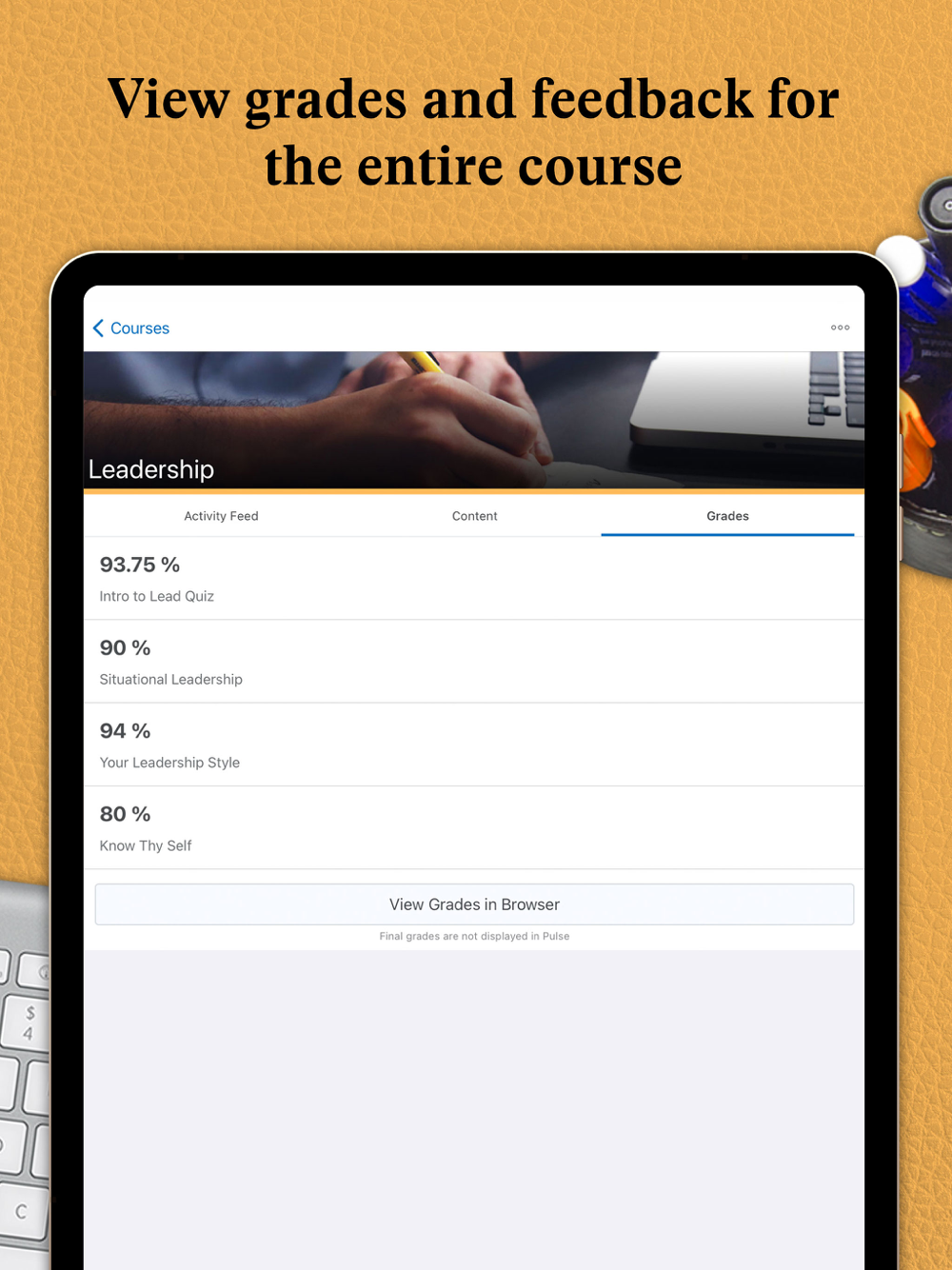 - Review course content off-line without a data connection, including video and audio content