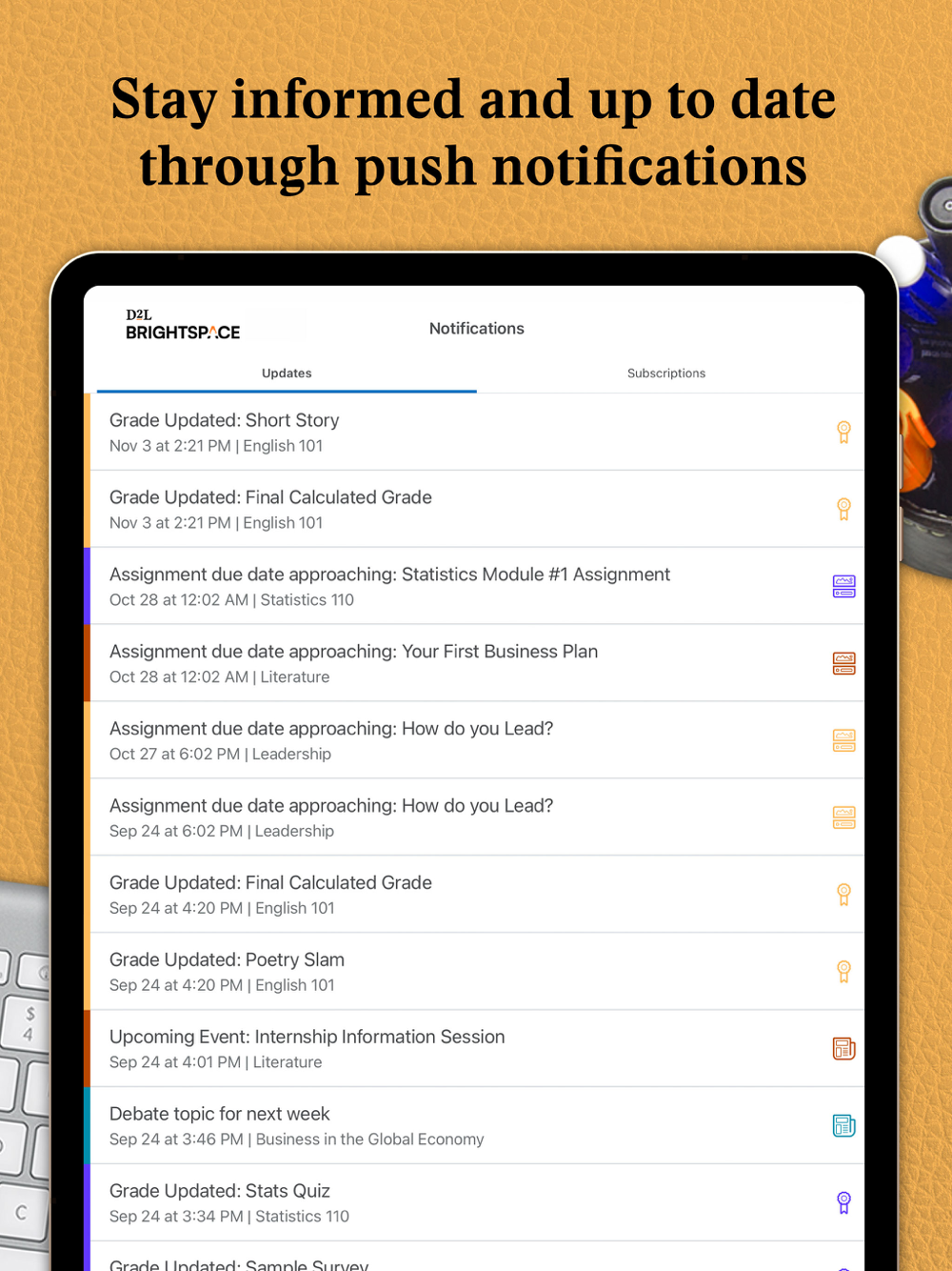 - Stay up to date about course-related updates such as Announcements, Activity Feed, Grades, Quizzes, and Assignments, all through push notifications