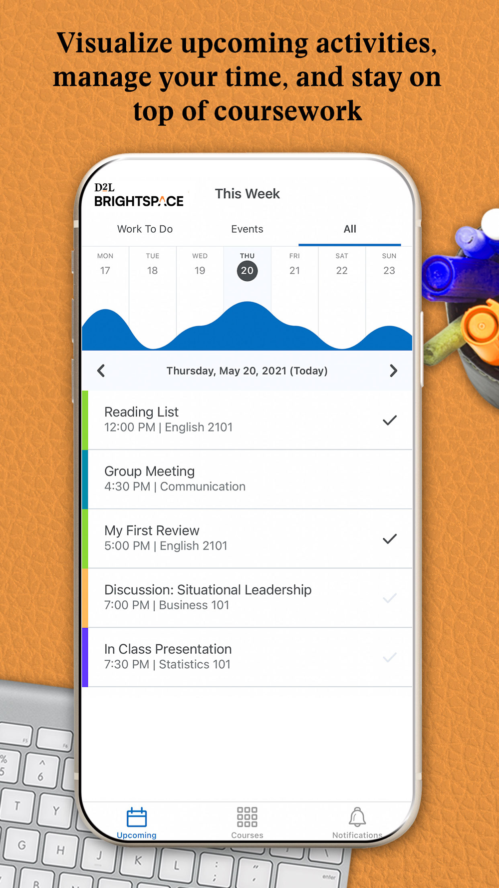 Help instructors and learners stay connected anytime, anywhere, with the Brightspace Pulse App. The app allows you to visualize upcoming activities, manage your time, and stay on top of coursework.