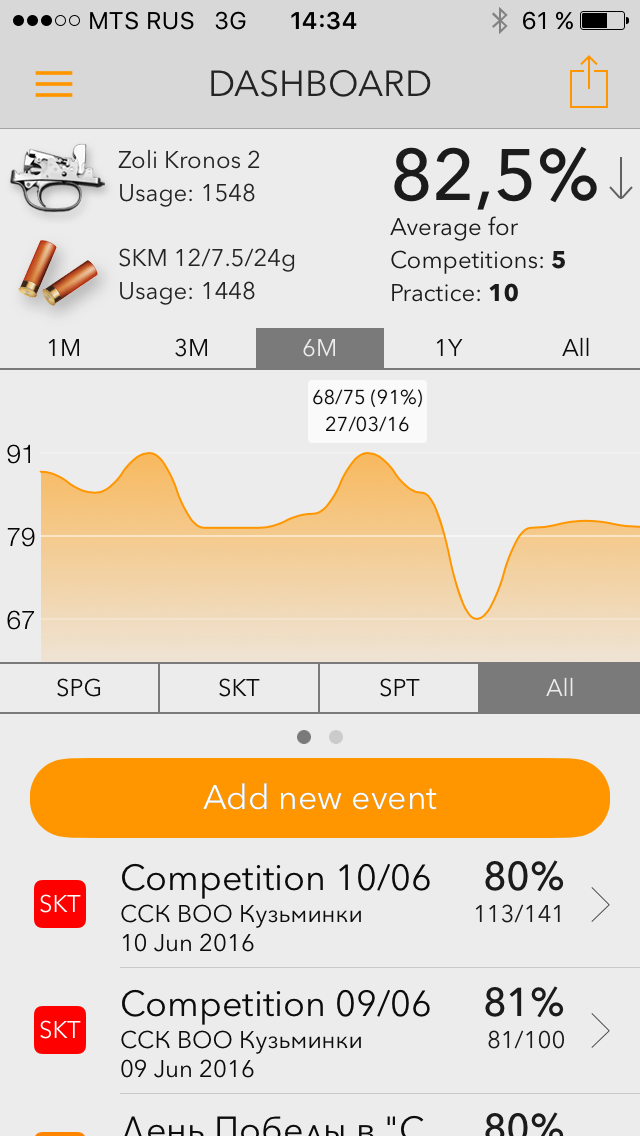 Shooting Day is easy-to-use score tracker for sportsmen clay shooters. Track and analyze your score for competition and practice clay shooting events. Contains 500+ US clay shooting clubs. Made for shooters by shooters. Capture everything influencing your sports performance. Manage your shooting performance having not only intuition but a powerful analytical tool with a full track record of your shooting career. Share your success in clay shooting with your friends! Shooting Day allows you to track and analyze: - your scores for competition and practice events - visits to clubs and shooting grounds and statistics for each venue youve shot at - statistics for all shotguns and cartridges you use - your personal observations, notes and your coach comments - weather, your mood, comfort, preparedness and your overall evaluation of an event Most popular shooting sports are supported: - Compak Sporting / FITASC - English Sporting - Sportrap / Five Stand - Skeet - Trap Application does not require Internet connection and is ad-free.