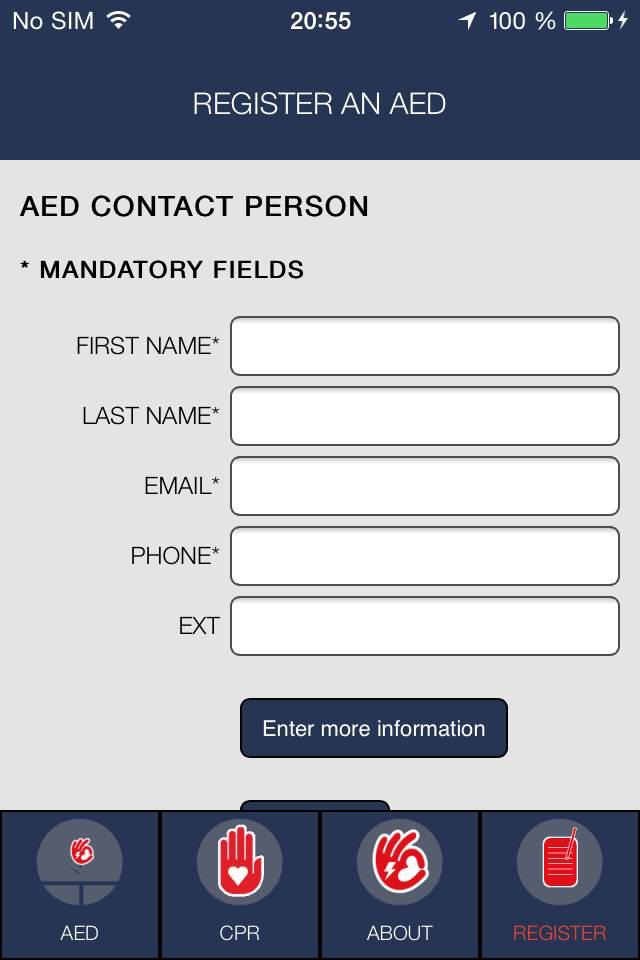 This application allows users to locate nearest automated external defibrillator (AED). It also allows to register location and information of an AED in a provincial registry maintained by Fondation Jacques-de Champlain. It also remains the main steps of cardiopulmonary resuscitation and facilitate access to Fondation Jacques-de Champlain website to help users getting more information or to do a secure online donation.
