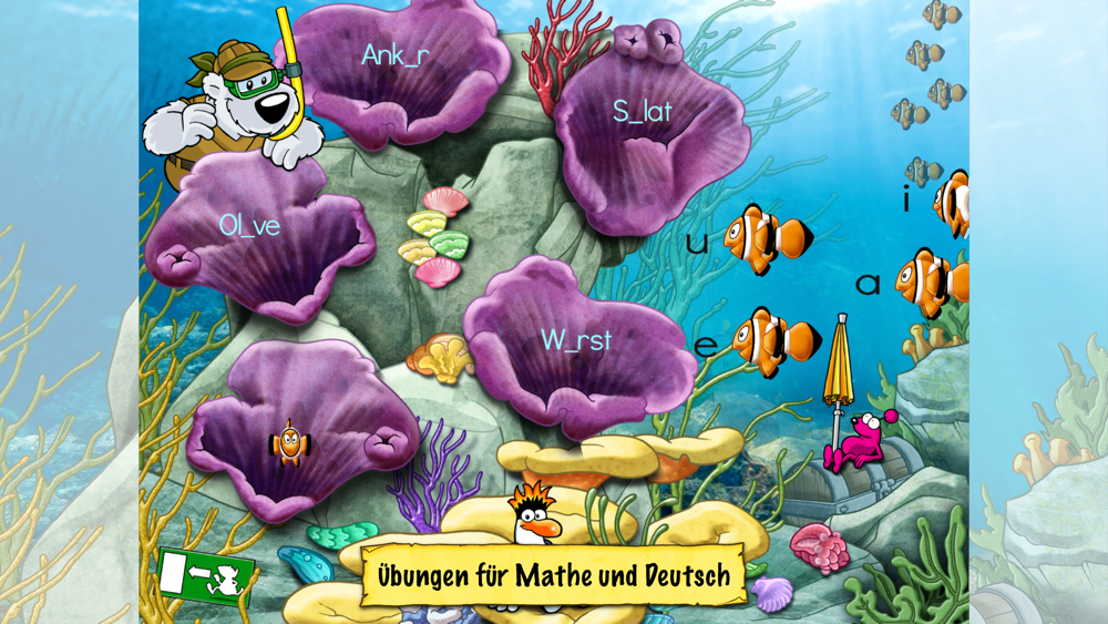 Hilf den Clownfischen, ihre Höhle zu finden, besuche den grimmigen Kraken, finde heraus, was sich in den Riesenmuscheln versteckt und bestaune die Haie in der Waschanlage.