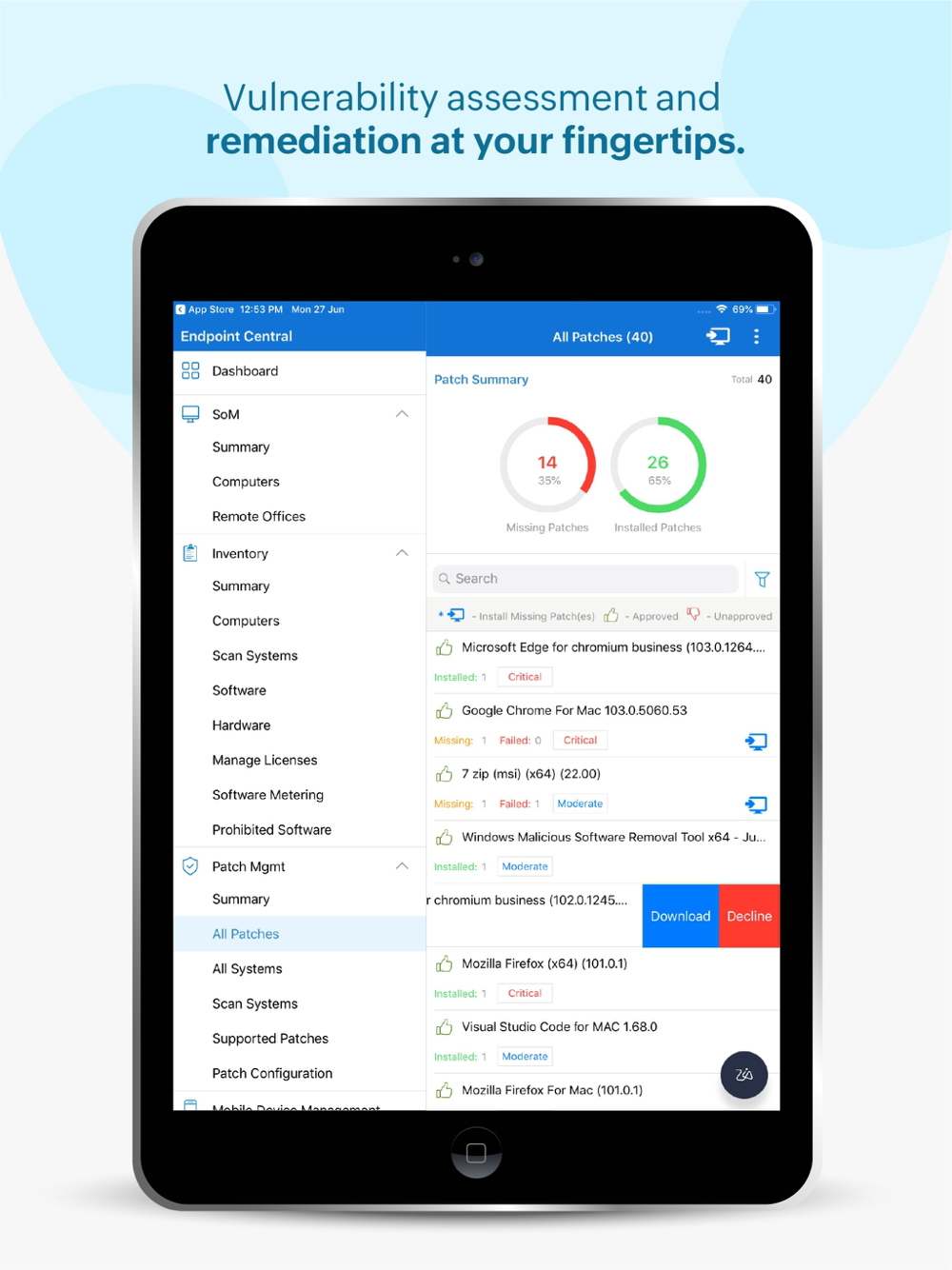 ManageEngine Endpoint Central iOS app formerly known as Desktop Central empowers admins perform key desktop management routines on computers across the globe. It enables IT Administrators to perform these tasks on the go and frees them from being stuck to the office to do these routines, thereby making them more productive. It helps them add or remove computers to manage, scan computers to get complete hardware and software assets, check software license compliance and more. You can also perform various patch management activities like approving patches, declining patches, viewing system's health status etc.