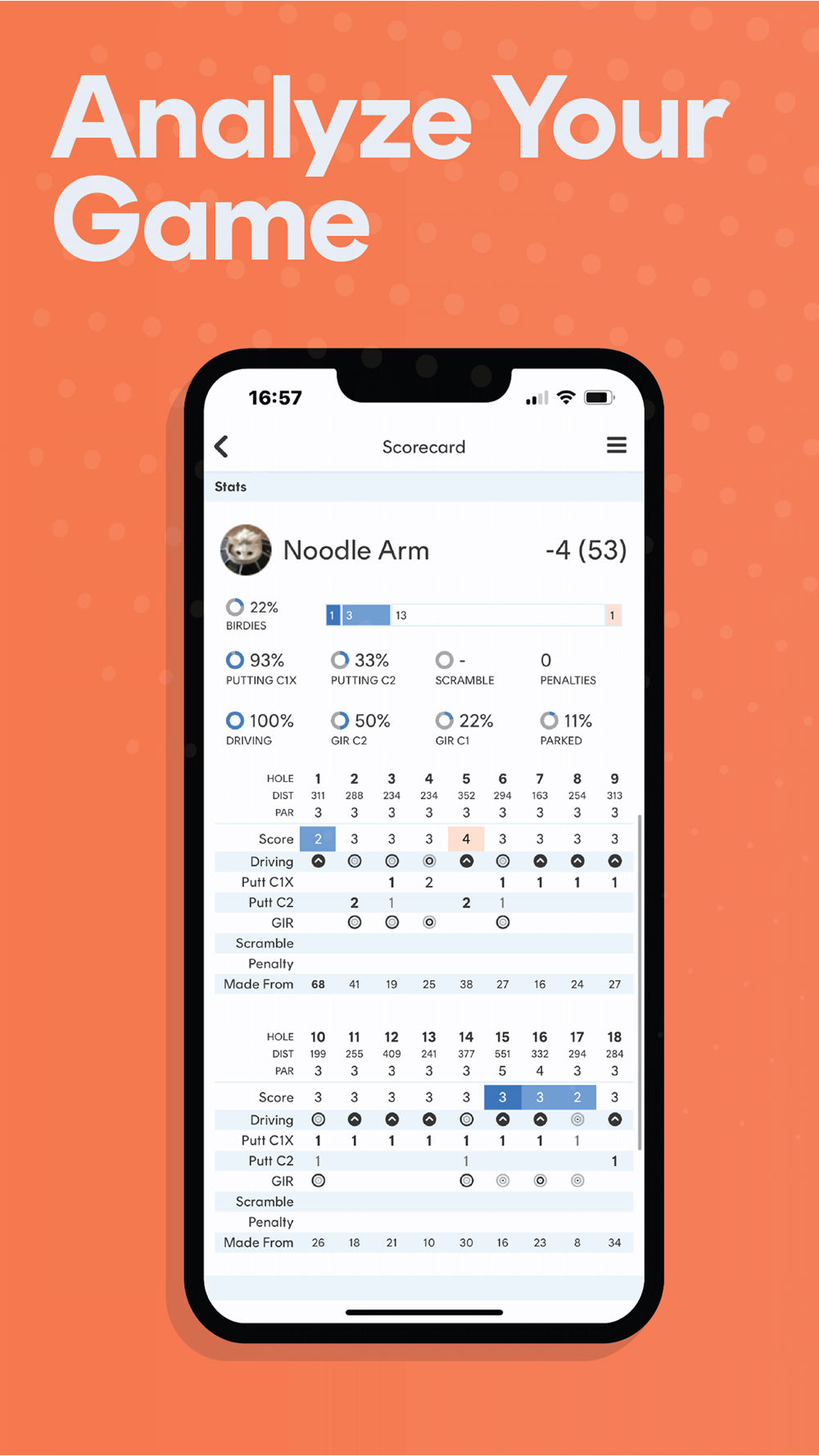 - Multiple scoring modes - strokes, full stats, or map-based scoring