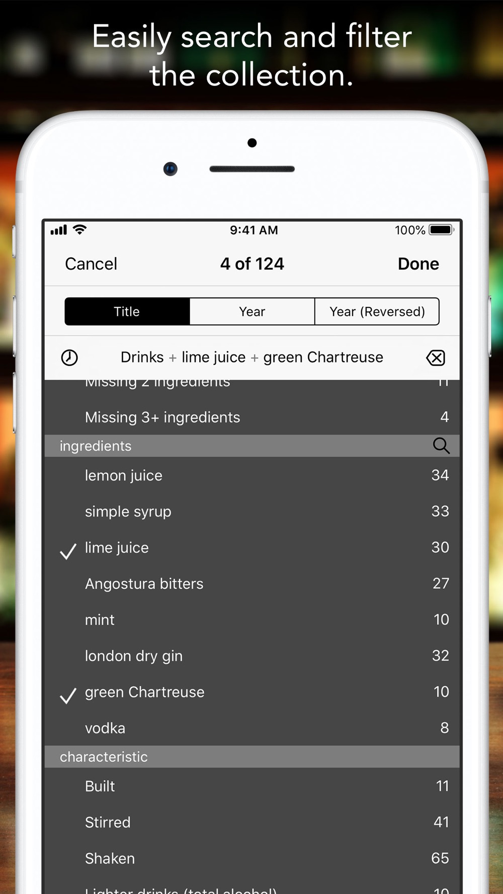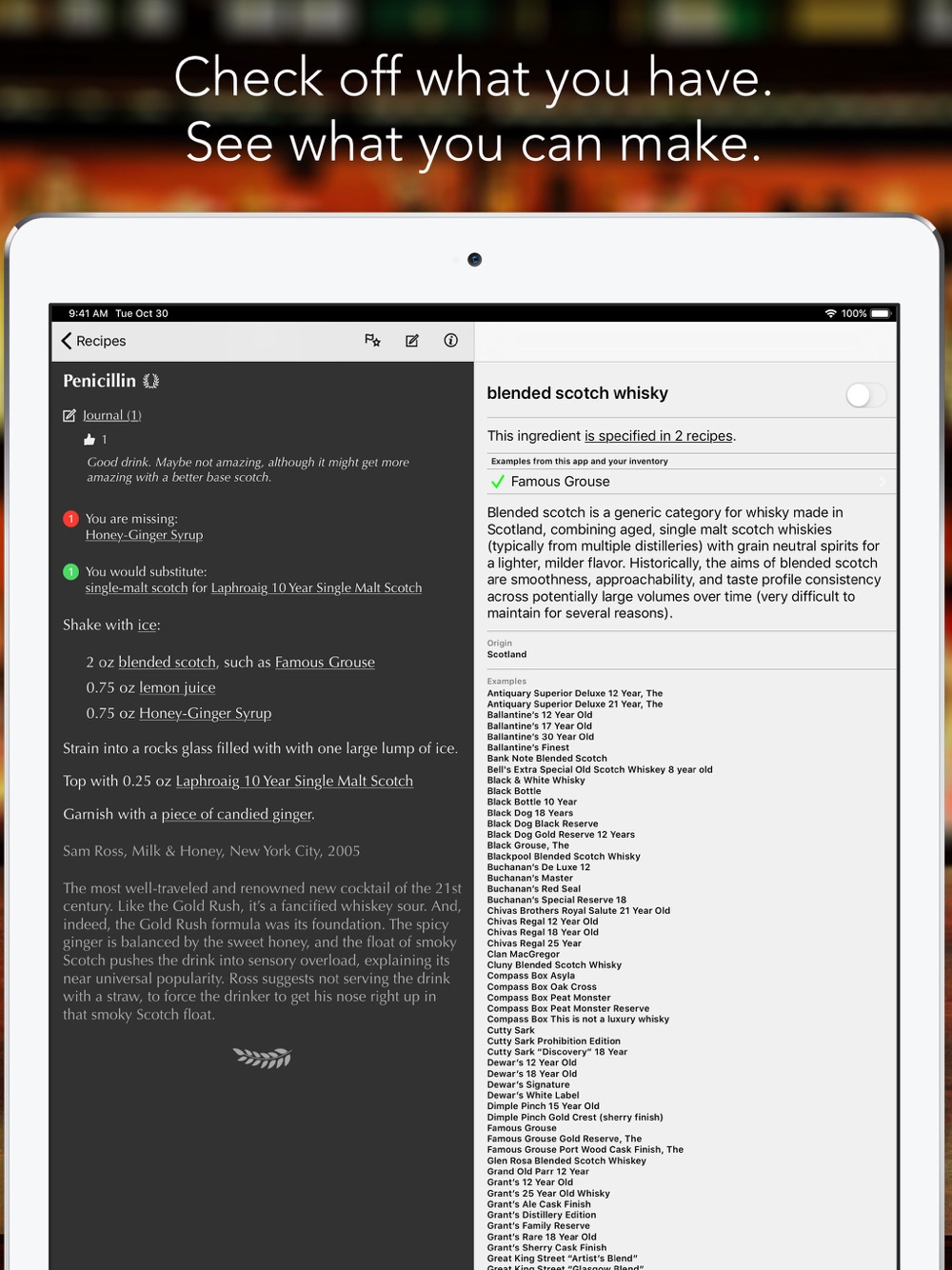 - Check off the ingredients you’ve got and this app will show you which drinks you can make