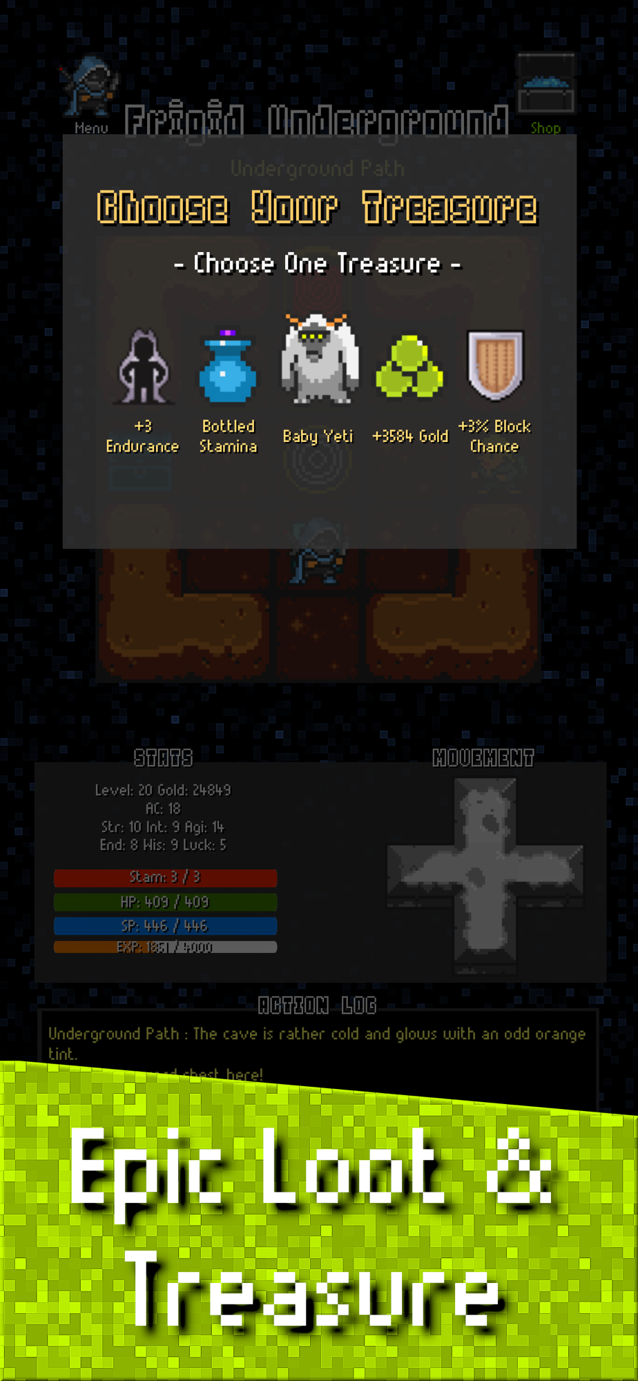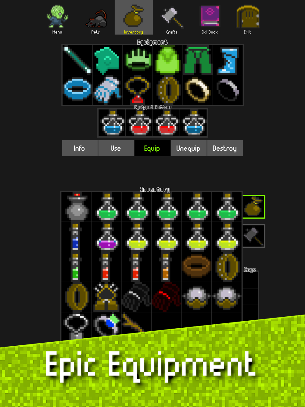 12 equipment slots to to fully customize your characters - (Weapon, Shield, Helmet, Chest, Gloves, Legs, Boots, Belt, Bracelet, Necklace, 2x Rings)