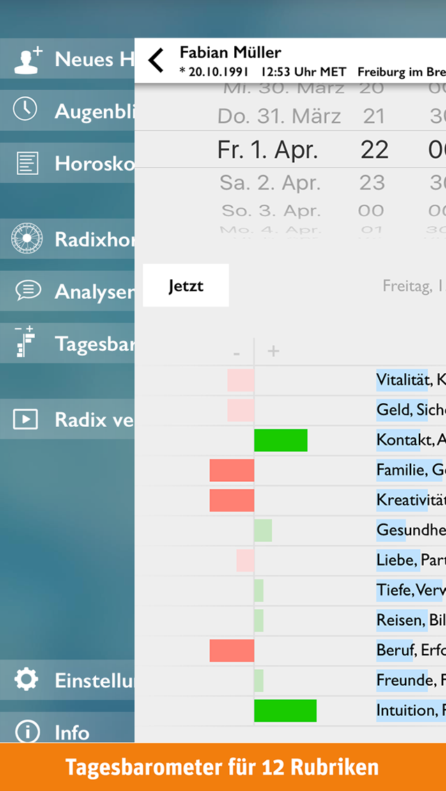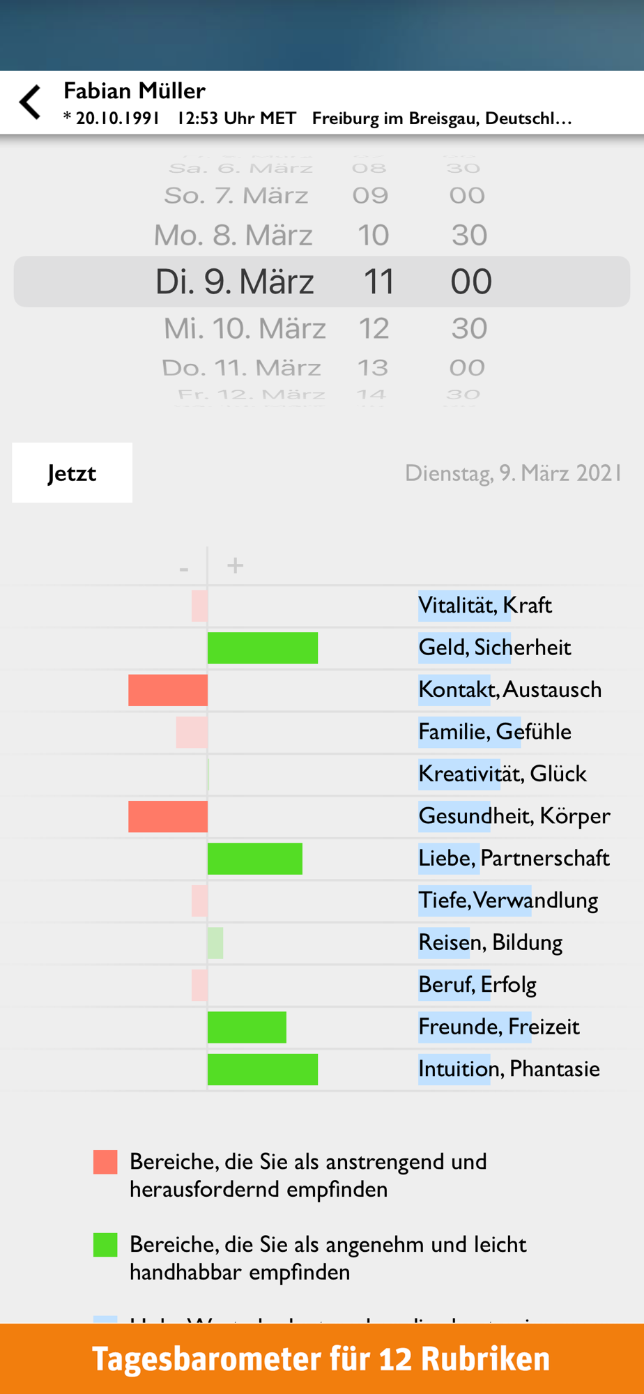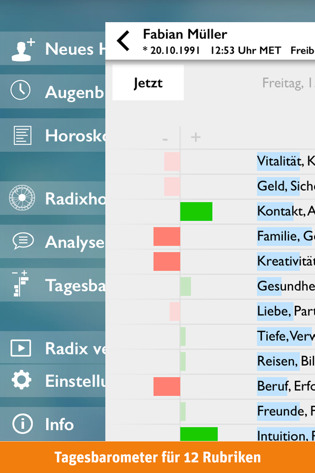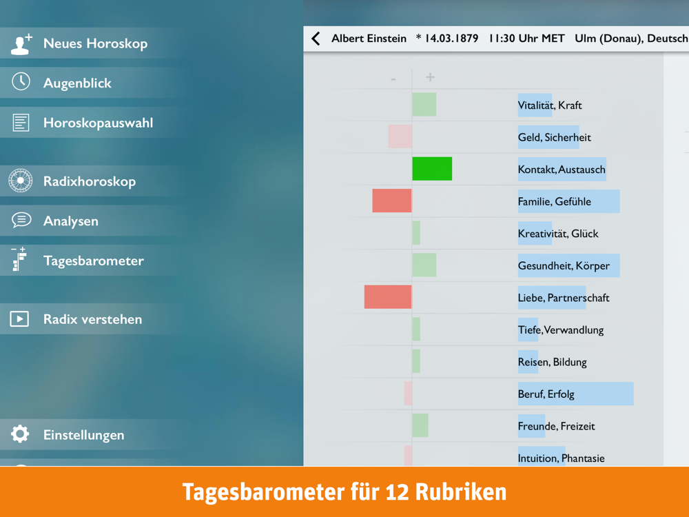 • Tagesbarometer mit Kurzanalyse zu zwölf Themen wie Gesundheit, Familie, Liebe, Beruf, Geld, Kreativität oder Freundschaft