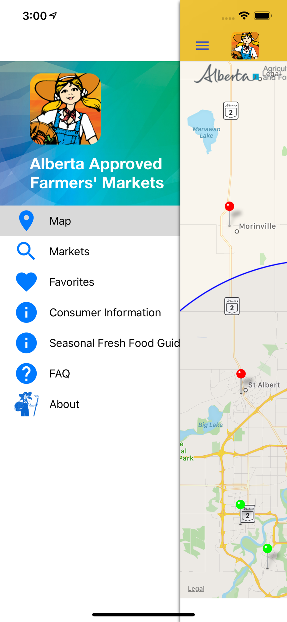This Alberta Farmers’ Market application guides you to your nearest Alberta approved farmers’ market. The application uses your present location to map all local Alberta approved farmers’ markets with information on each market and links to websites and social media when available. The data is provided by the Ministry of Agriculture and Forestry in Alberta, Canada.