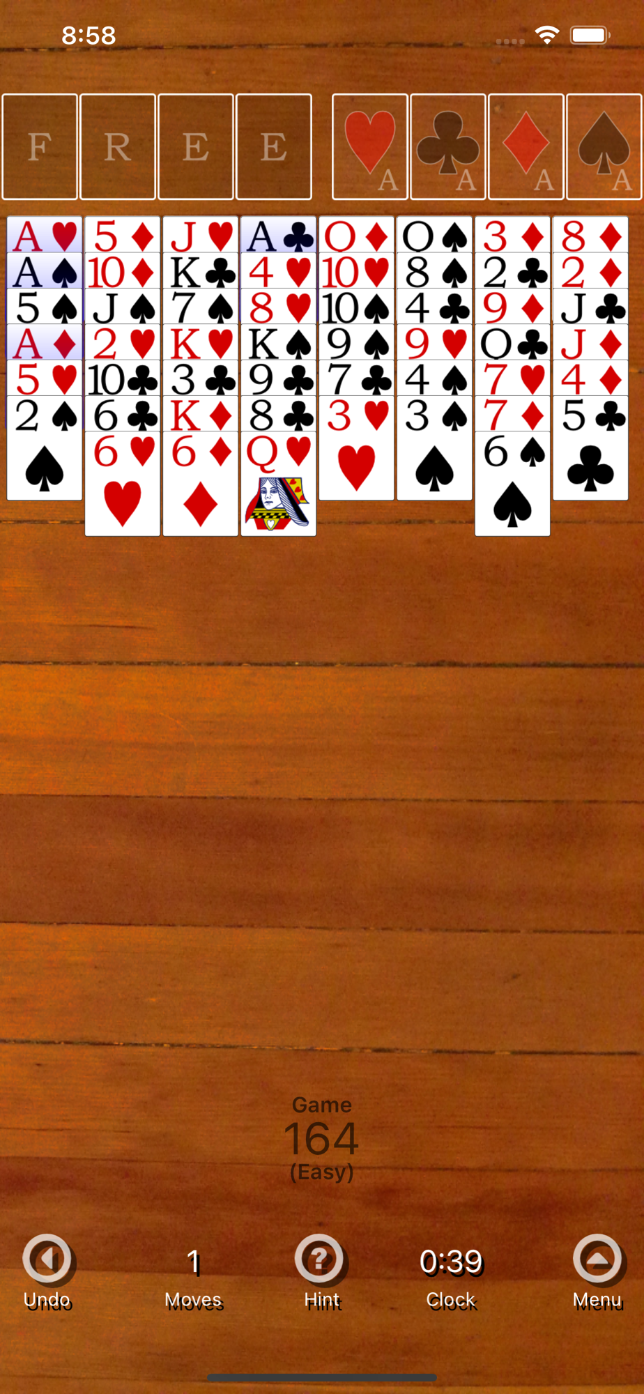 Statistics are kept for moves count, time to win, hints used, and undo's used, so you can see yourself improving over time.